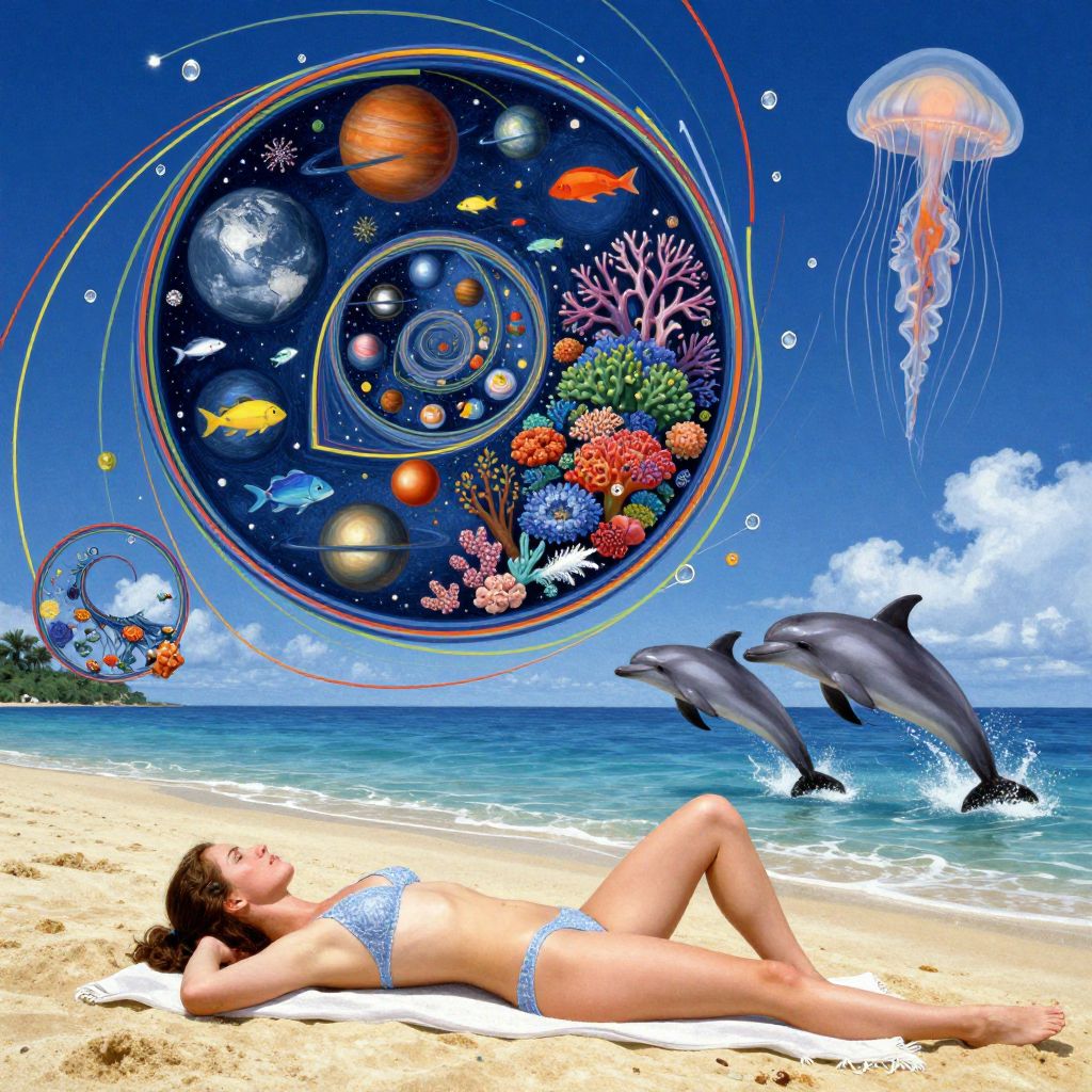 James Gurney young woman sunbathing, desert island, ocean, dolphins, jellyfish, corals, fish, planets inside a Fibonacci spiral, abstract colored lines and drops, Titian, Tom Bagshaw,