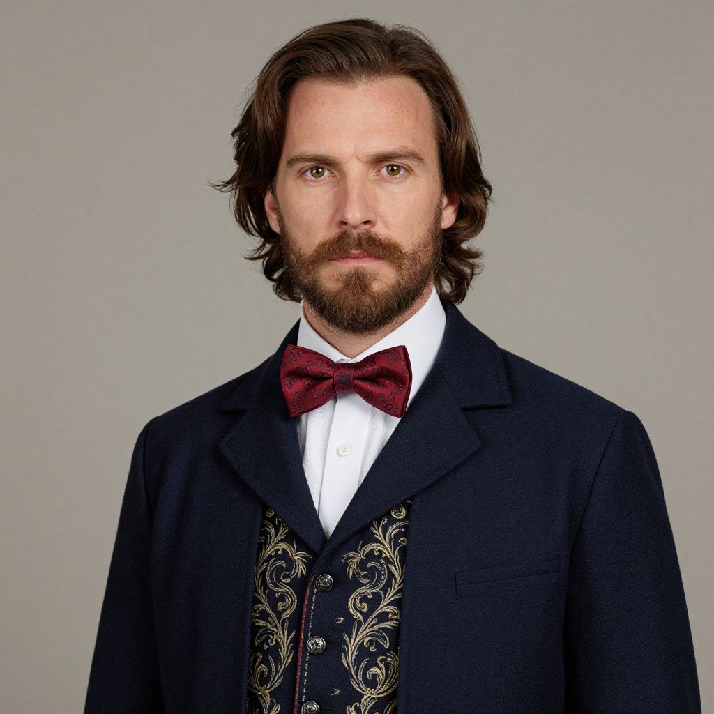 Man with blonde hair and a beard wearing a black coat with a brown vest and a white bow tie.