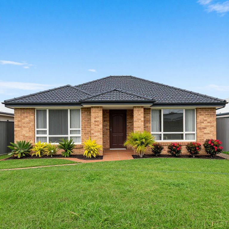 Photograph of a small, single-story suburban house with a dark gray, shingle roof. The house has light brown brick siding and white-framed windows on either side of a dark brown front door. The front yard features a well-maintained green lawn, bordered by small, colorful shrubs including yellow and green plants on the left and red flowers on the right. A narrow, red-brick walkway leads to the front door. The sky above is bright blue with a few scattered clouds.