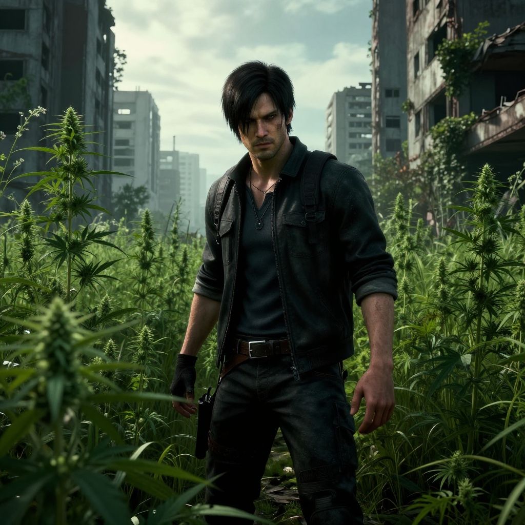 Leon Kennedy amidst towering weed plants in an abandoned cityscape, overgrown nature blending with urban ruins, highly detailed, moody colors, Resident Evil theme