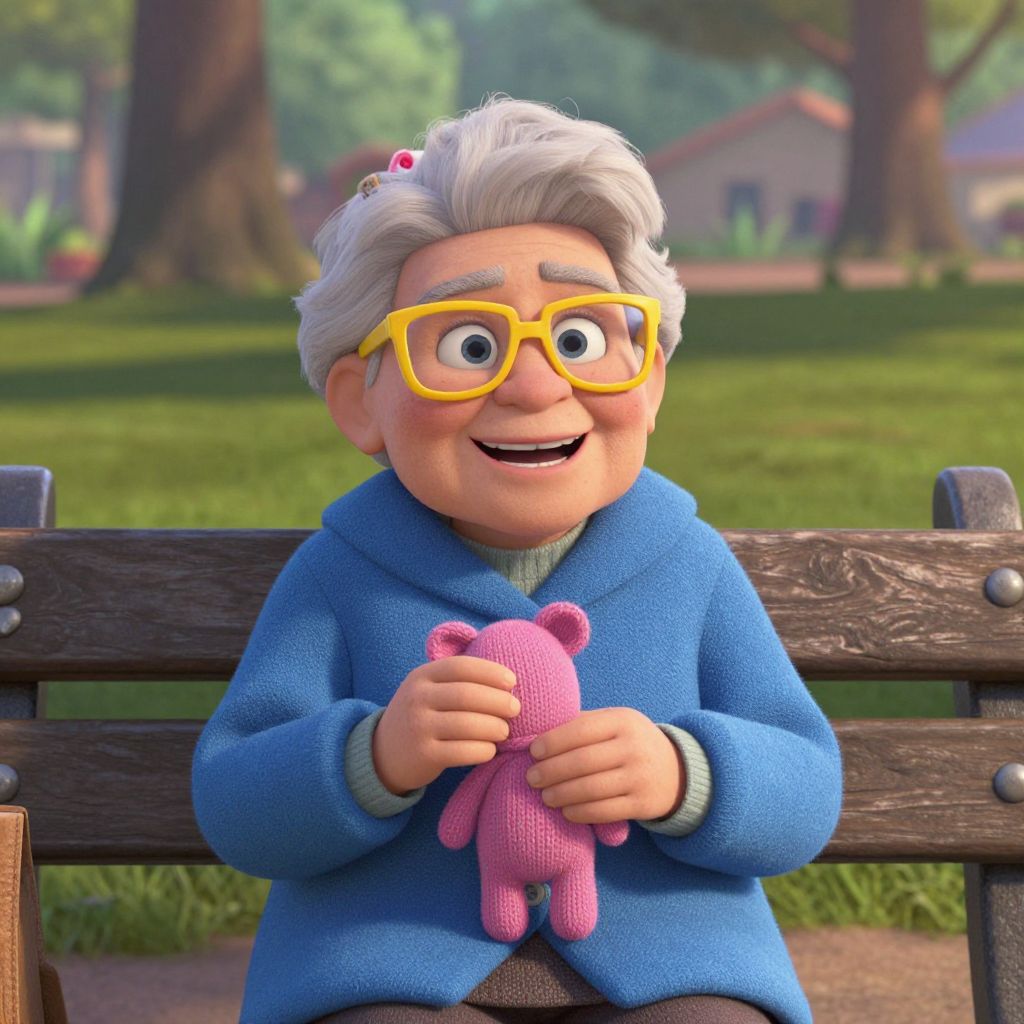 An elderly woman in a blue coat, wearing yellow glasses, sits on a park bench holding a pink knitted toy, with a joyful expression on her face, on a sunny day, in a Pixar-style movie with film grain.