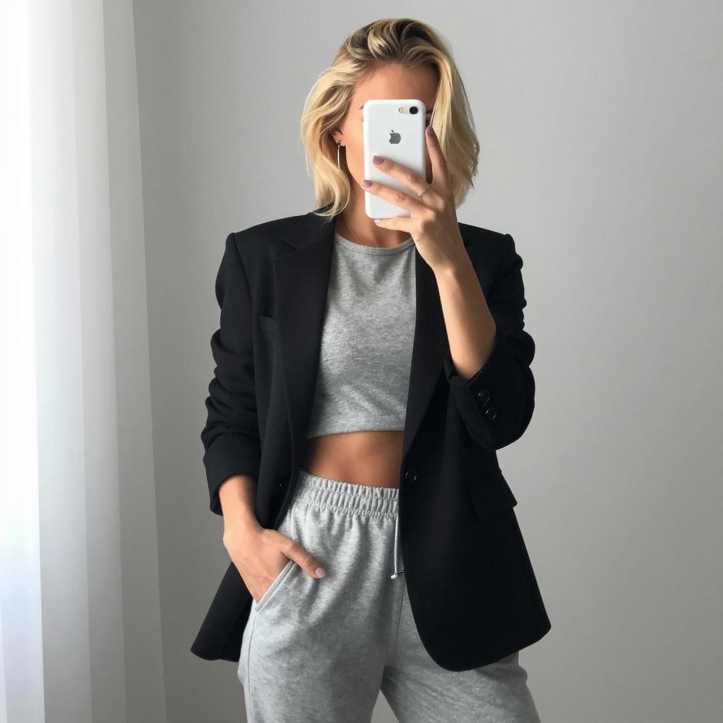 Blonde woman taking a mirror selfie with a white iPhone, dressed in a grey crop top and matching grey sweatpants paired with a black blazer. She stands against a light gray wall with a white curtain on the left. Her right hand is in her pocket while her left arm is holding the phone.