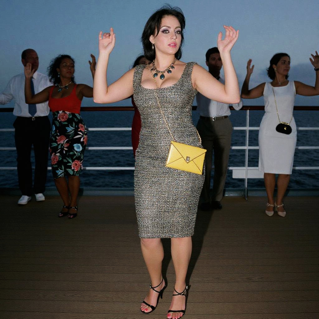 A lanky woman in a chic tweed sleeveless dress with a fitted silhouette and black strappy heels stands on a cruise ship deck during an evening dancing class, complemented by a statement necklace and a yellow envelope-style clutch. The scene is captured in an oversaturated film style. Sexy. Pretty face and beаutiful eyes. Big breasts