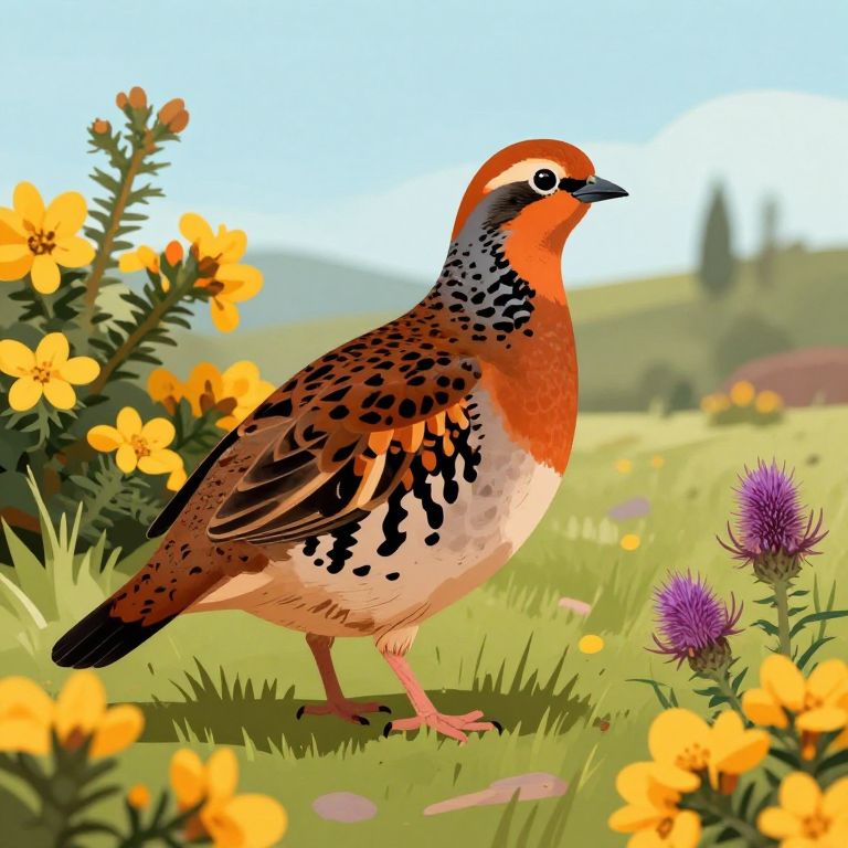 Vibrantly illustrated English Partridge stands alert amidst gorse and thistles, its plumage showcasing intricate patterns of orange, brown, and black against a serene natural backdrop.