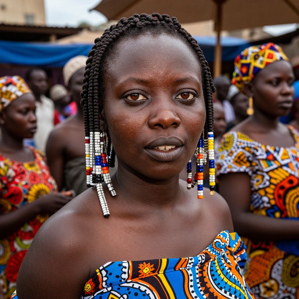 Craft a photorealistic portrait of an African woman exuding energy and warmth with her rich skin tone and captivating hazel eyes. Amidst the vibrant West African market's chaos, her intricate braids adorned with colorful beads glisten in the light. Her expression encapsulates wisdom, warmth, and quiet strength, inviting viewers into an intimate moment that symbolizes resilience and a deep community bond. Captured from a low angle just above ground level, the photograph emphasizes the intricate patterns of her vibrant garments and the rich textures of the bustling market's surroundings. This perspective also accentuates the intensity of her gaze, serving as a powerful testament to the enduring spirit of this dynamic region.