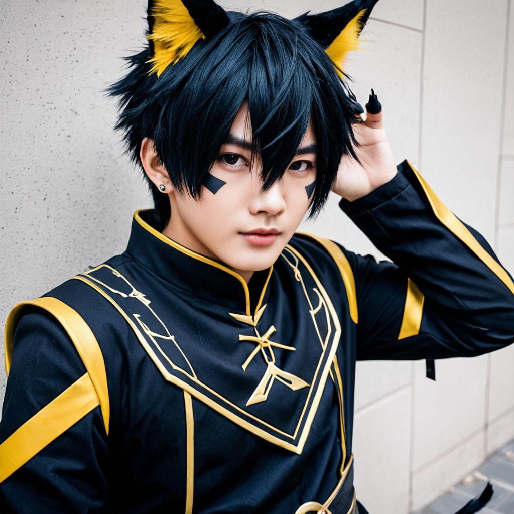 Photo-realistic cosplay portrait of a young male with black short hair and cat ears. The subject wears a detailed black costume with yellow trim inspired by Chinese-style clothing. Additional features include black nail polish, ear piercing, and black face markings. The pose is confident, with one hand adjusting the cat ears. Background is a neutral urban setting with tiled wall.