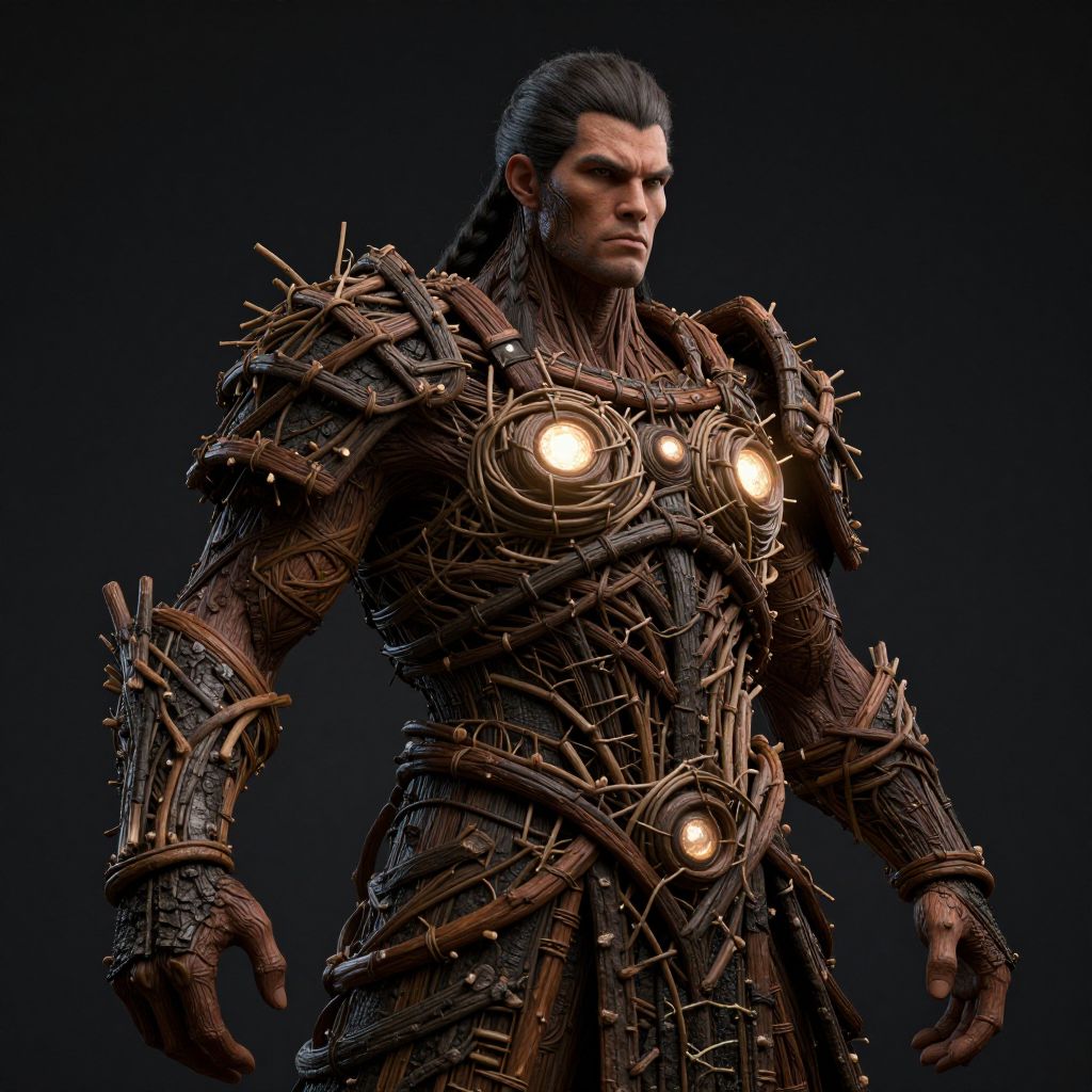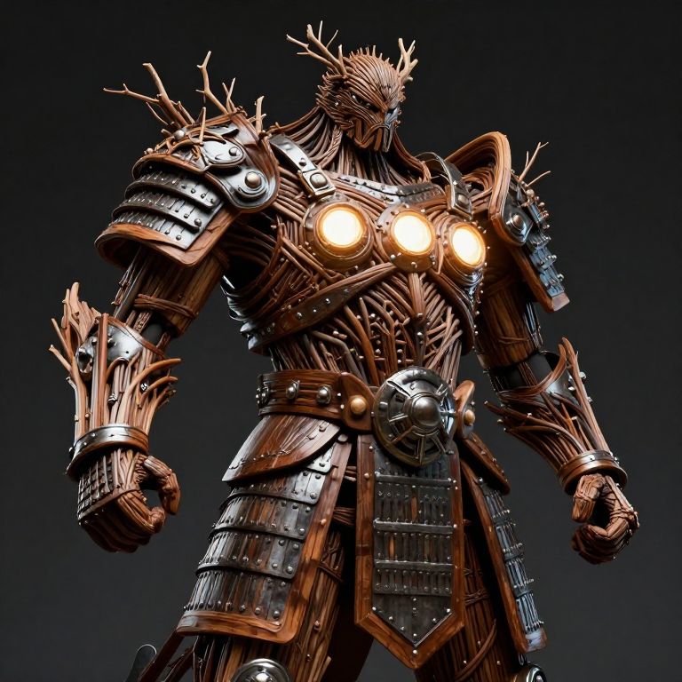 A giant warrior adorned in intricate wooden armor made of a complex weave of branches and metal inserts, with three luminous spheres on the chest, stands with a proud and ready stance, surrounded by a crown of bare branches.