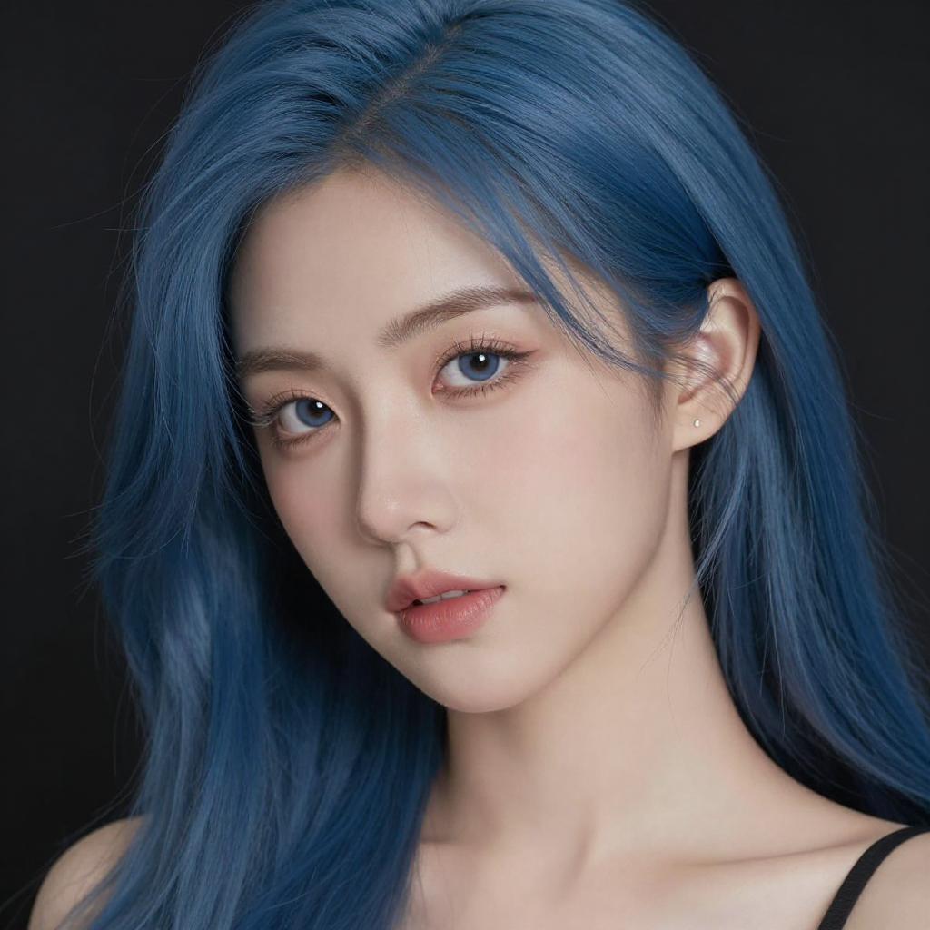 Photorealistic digital portrait of an East Asian woman with fair skin and striking blue hair that falls past her shoulders. She has large, almond-shaped blue eyes, subtle pink lips, and a small, delicate nose. Her eyebrows are thin and well-groomed. She wears a black spaghetti strap top, visible at the shoulders. The background is solid black, making her vibrant hair and soft facial features stand out. The lighting is soft, highlighting her smooth skin and giving her a slightly ethereal appearance. The overall style is hyper-realistic with a focus on natural beauty and detailed textures.