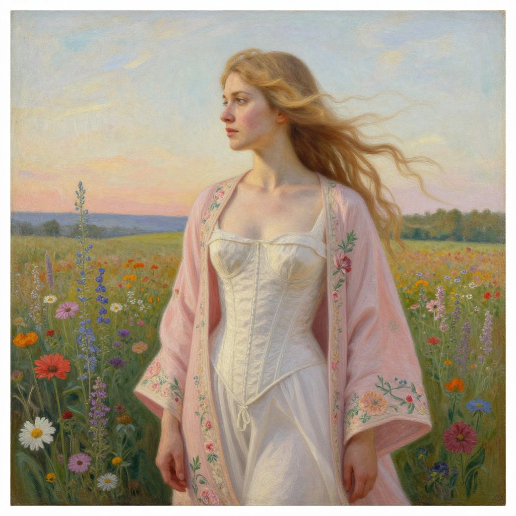 Digital painting of a blonde woman with flowing hair, wearing a white corset and pink floral robe, standing in a vibrant meadow with colorful wildflowers