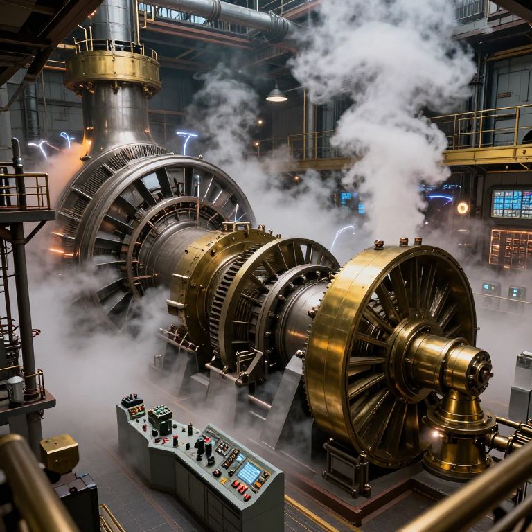 GregTech futuristic power plant, colossal steam engines and turbines surrounded by complex control panels, dynamic steam clouds and electrical arcs, detailed mechanical structure with brass and steel materials, blending Victorian and sci-fi aesthetics, immersive industrial setting