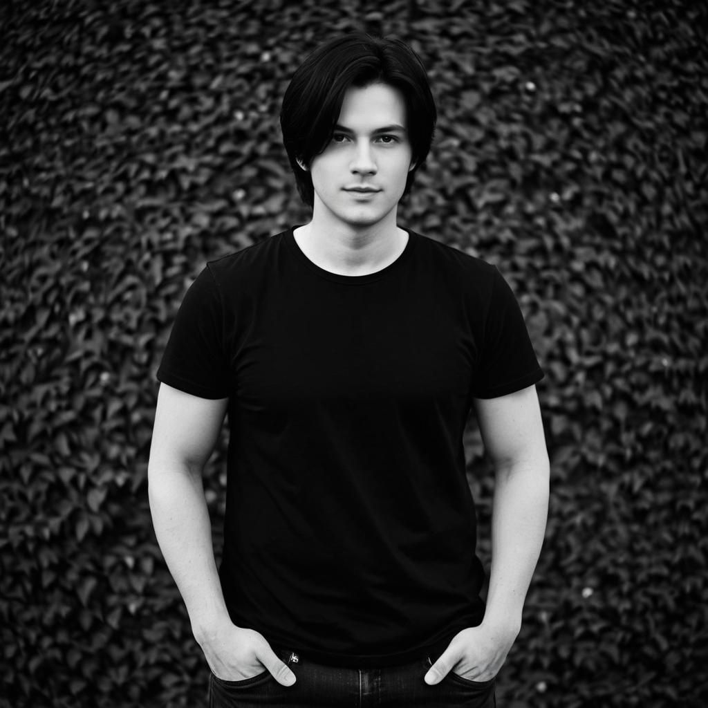 Monochrome medium shot of a young man with short dark hair wearing a casual black t-shirt and jeans. The image features a blurred circular bokeh background, emphasizing the subject's relaxed pose with hands in pockets, conveying a minimalist and casual style.
