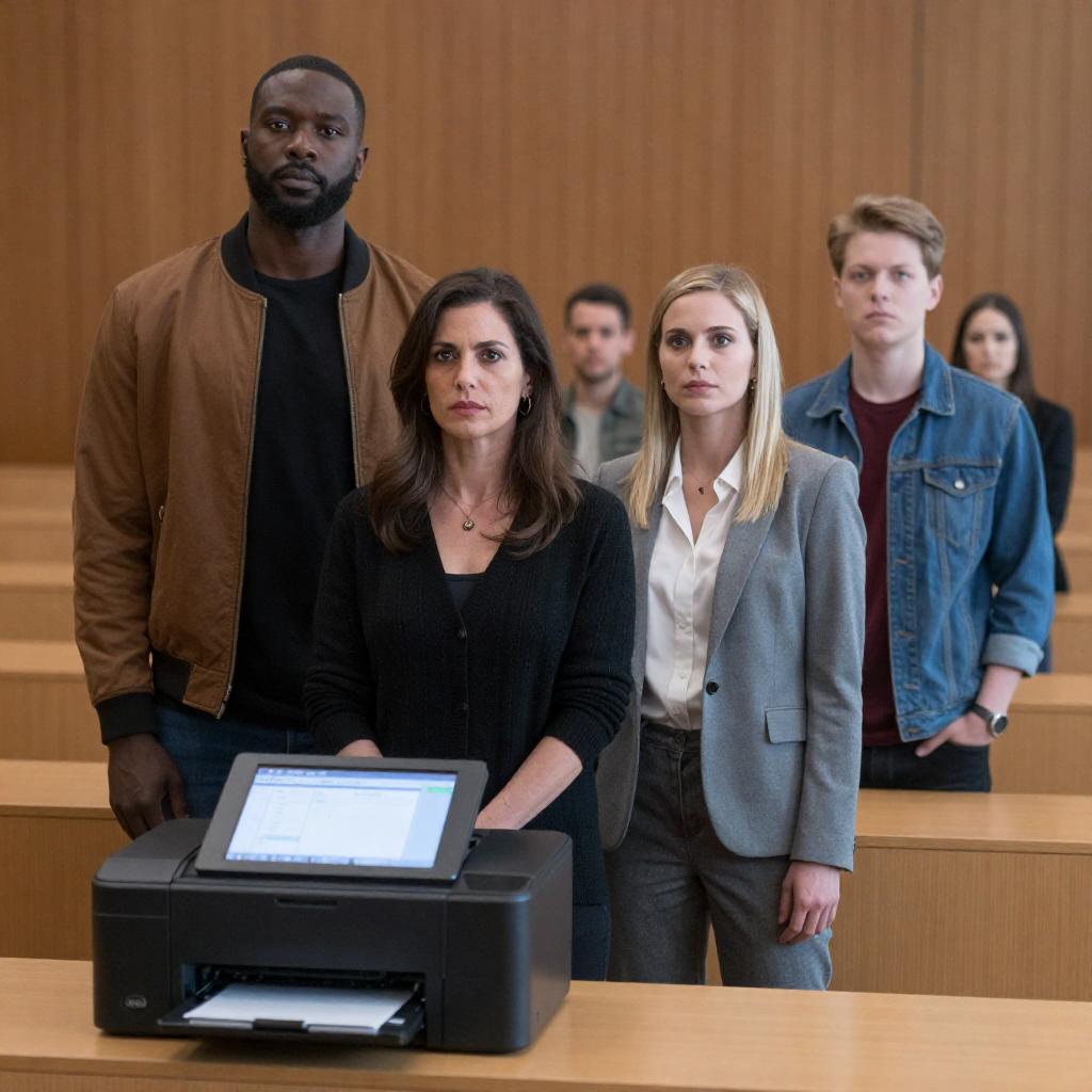 Photograph of four people walking on a brick path in a suburban park. Foreground: curly-haired boy in dark jacket, light blue shirt, purple bag. Center: red-haired woman in dark jacket, blue dress. Right: bearded man in black hat, black shirt. Far right: black man in purple shirt, red bag. Background: green lawn, trees, houses, lamppost. Casual attire, neutral expressions.