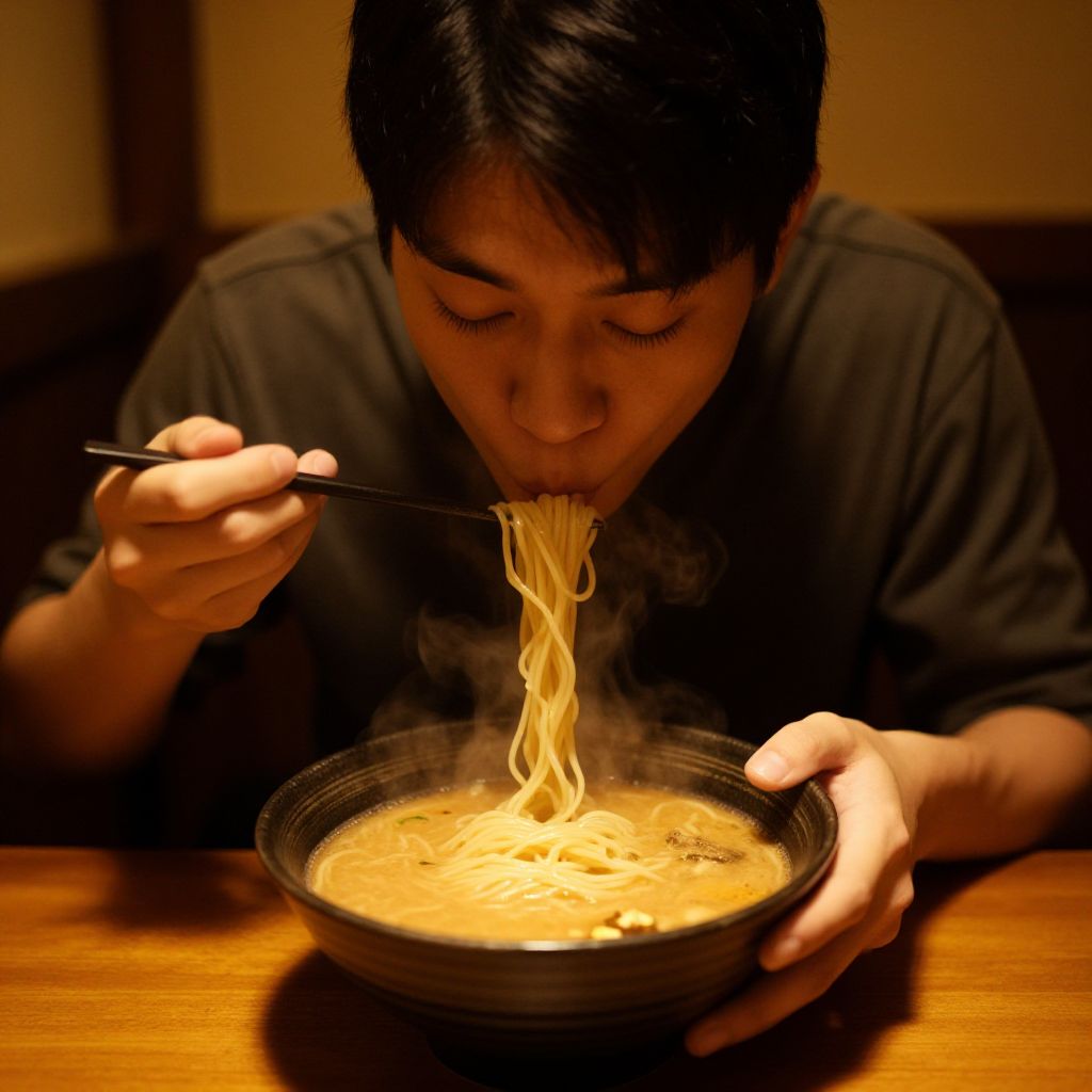 A photograph of an Asian man with short black hair, wearing a dark shirt, leaning over a bowl of steaming ramen noodles. He uses black chopsticks to lift a strand of noodles to his mouth. The ramen, with a rich, orange broth, sits in a dark bowl on a wooden table, illuminated by warm, yellow lighting that casts shadows. The background is blurred, focusing attention on the man and his meal. The image captures the textures of the noodles and broth, emphasizing the warmth and comfort of the scene.