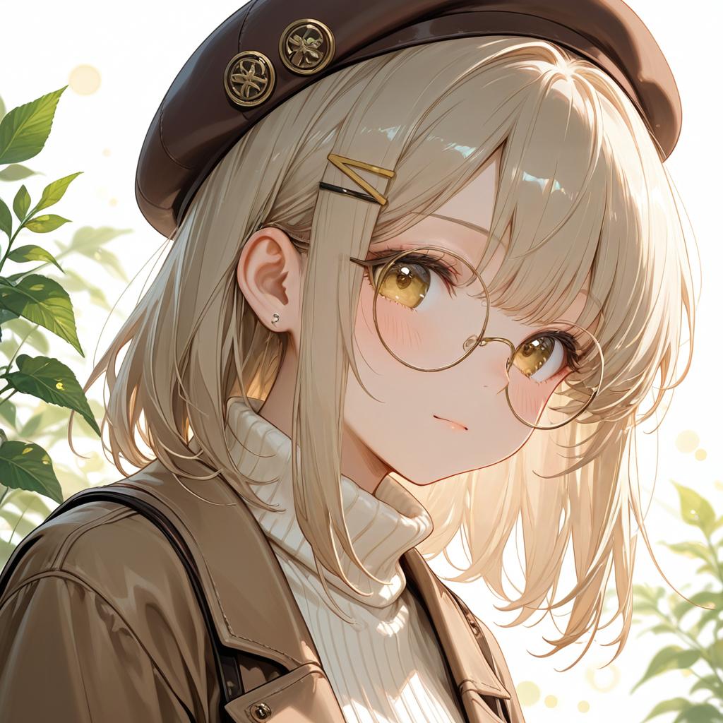 Close up, masterpiece, best quality, bokeh, cute, 1girl, solo, beret, hair clip, beige hair, round eyewear, brown jacket, turtleneck sweater, upper body, looking at viewer, yellow eyes, closed mouth, leaf, white background, plant