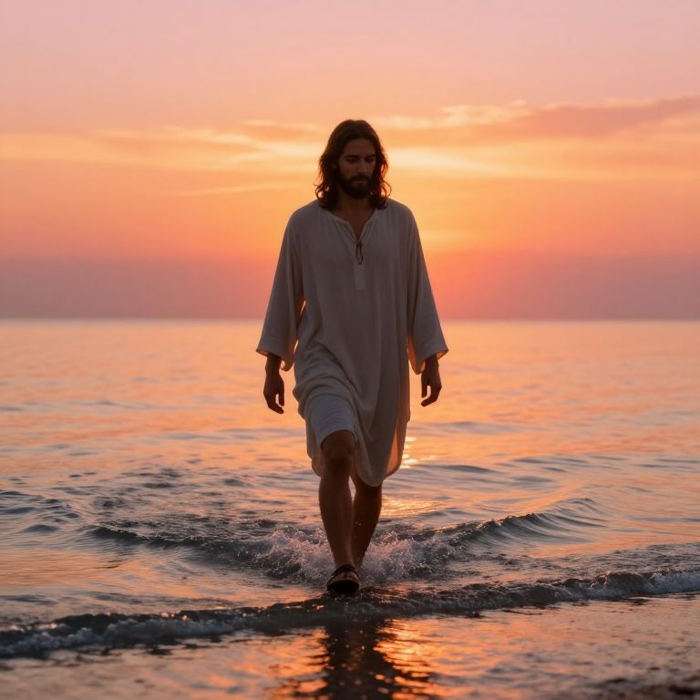 Realistic Jesus walking on water during sunset, warm orange and pink hues in sky, water reflecting vibrant colors, gentle waves around bare feet, peaceful and composed face, traditional sandals visible, subtle glow highlighting figure against tranquil sea.