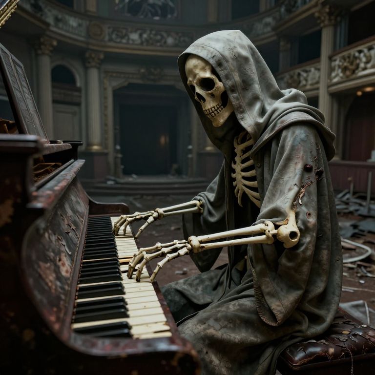 In a hauntingly atmospheric 3D-rendered scene, a skeletal figure draped in a flowing robe sits at a weathered grand piano, its ivory keys marred by decay, evoking a somber, cyberpunk-inspired ambiance within the abandoned opulence of a derelict opera house.