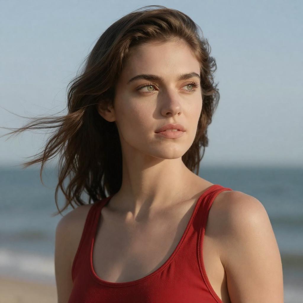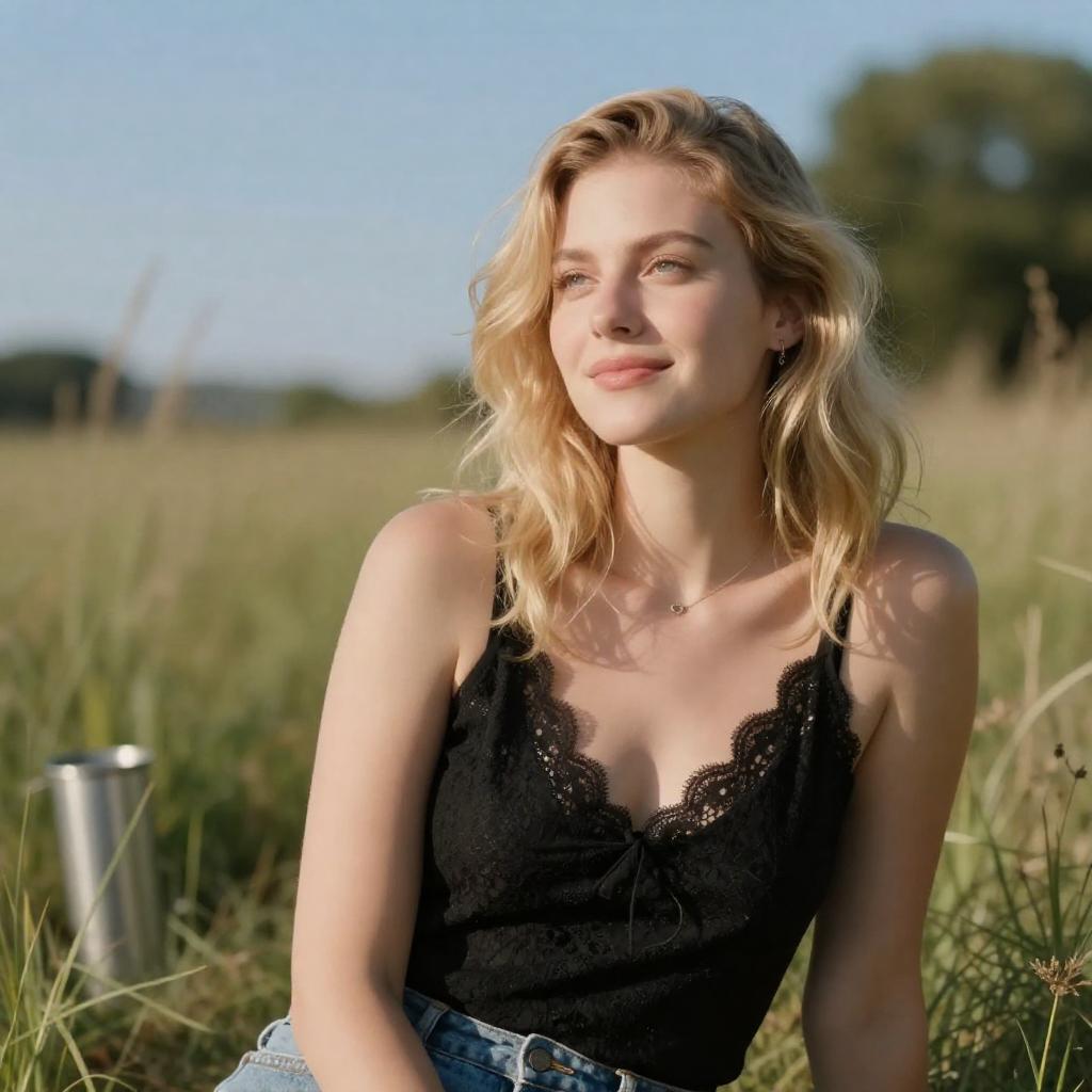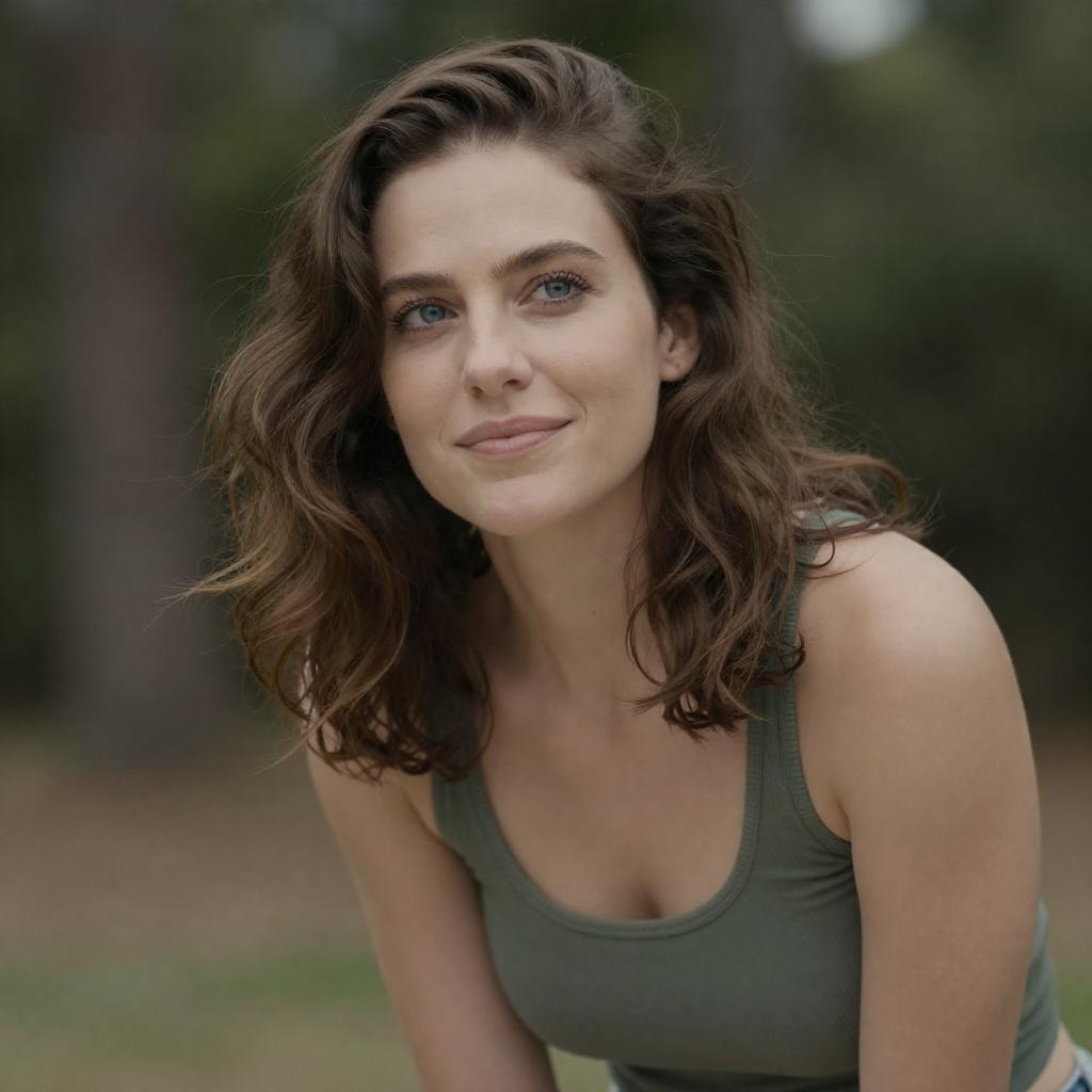 Photograph of a woman with light brown hair, wearing a purple tank top with pink lace trim and blue denim shorts. She sits on rocks, looking up with a slightly open mouth. Background includes a waterfall and rocks. She has a small pack on her right hip. Her tank top is wet, and her skin is glistening. The setting is outdoors, near a waterfall.