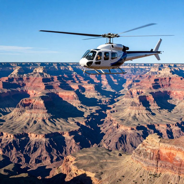 Helicopter soaring above the vibrant layers of the Grand Canyon, showcasing a scenic aerial view against a clear blue sky.