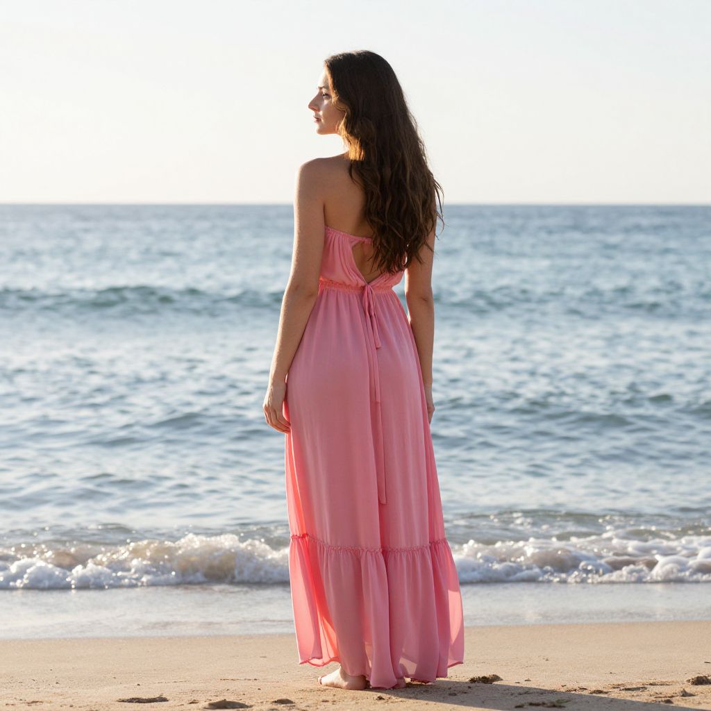 Photograph of a woman standing on a sandy beach with the ocean in the background. She faces away from the camera, showing her long, wavy, dark brown hair. She wears a sleeveless, pink, floor-length maxi dress with a tied back and a ruffled hem. The sunlight highlights her silhouette against the bright sky and gently rolling waves. She wears sunglasses and stands barefoot in the sand, creating a serene, peaceful atmosphere. The water's surface is slightly choppy, and the beach is mostly empty.