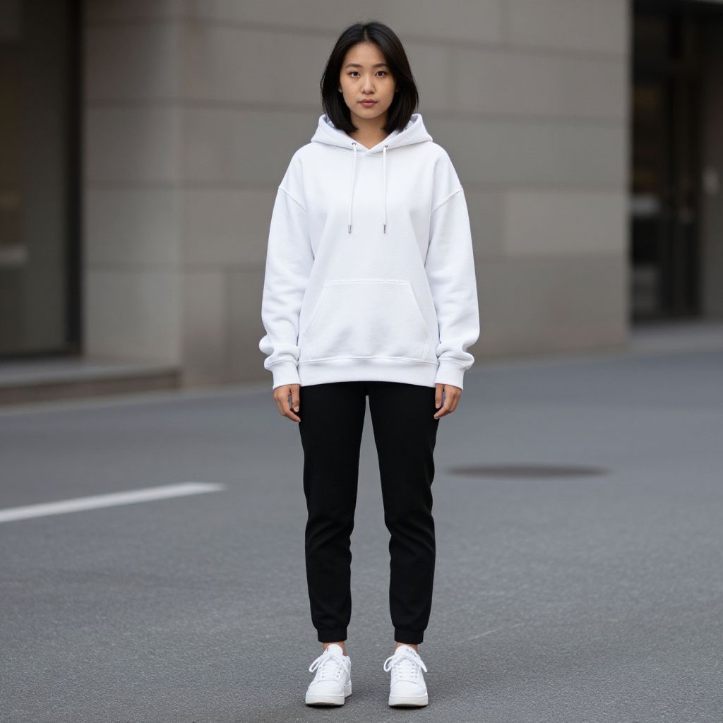Photograph of an Asian woman standing on an urban street. She has straight black hair, medium length, and a neutral expression. She wears a white, oversized hoodie with the hood down, black jogger pants, and white sneakers. The background shows a grey, stone building with large windows. The street is grey asphalt with a white line on the left. The overall style is casual and minimalist, with a focus on the contrast between her white top and black bottom. The image has a crisp, modern look with sharp details.