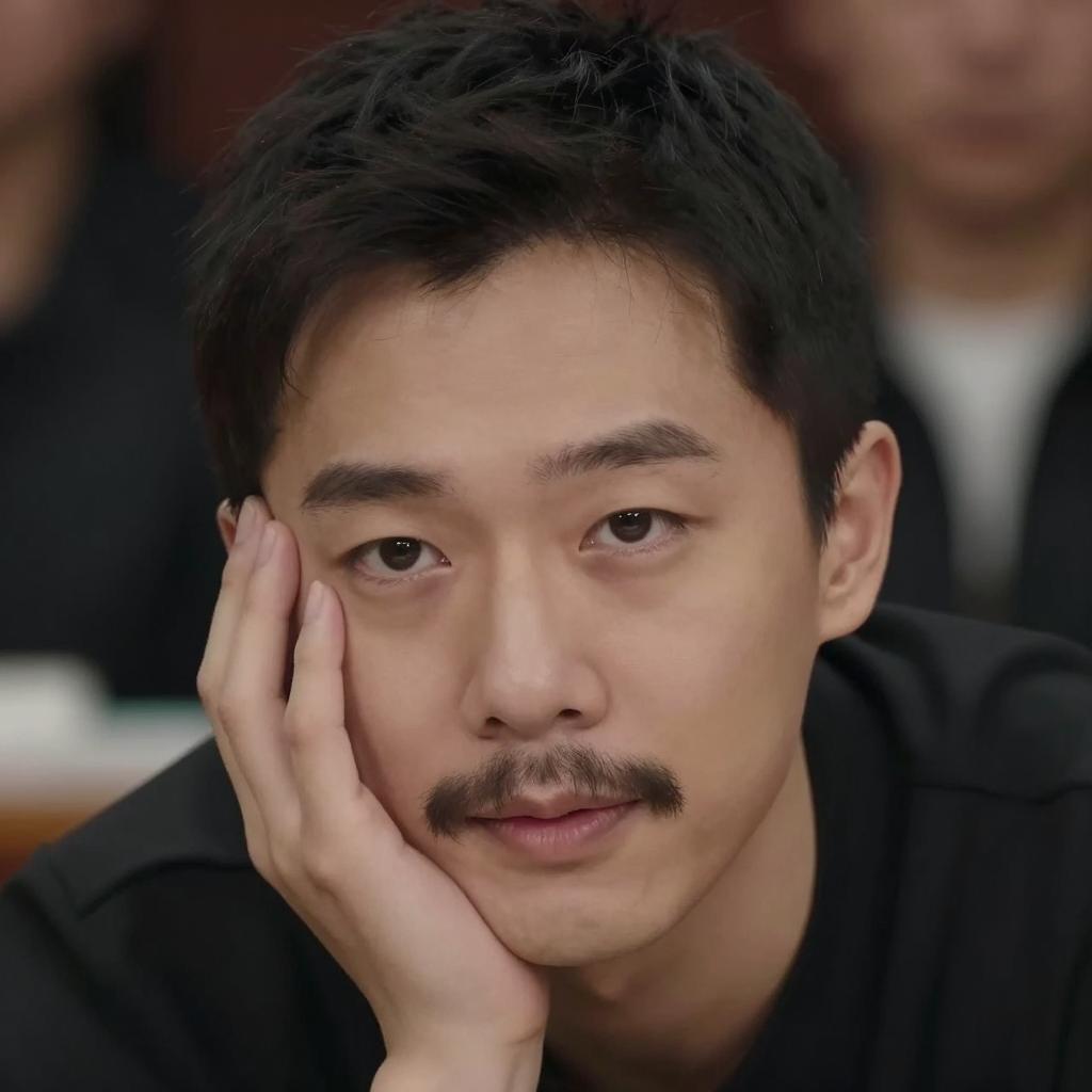 Close-up photograph of a man with a thin mustache, dark hair, and fair skin. He leans forward, resting his hand on his cheek, with a slightly open mouth and relaxed expression. Dark background, blurred figures in the background.