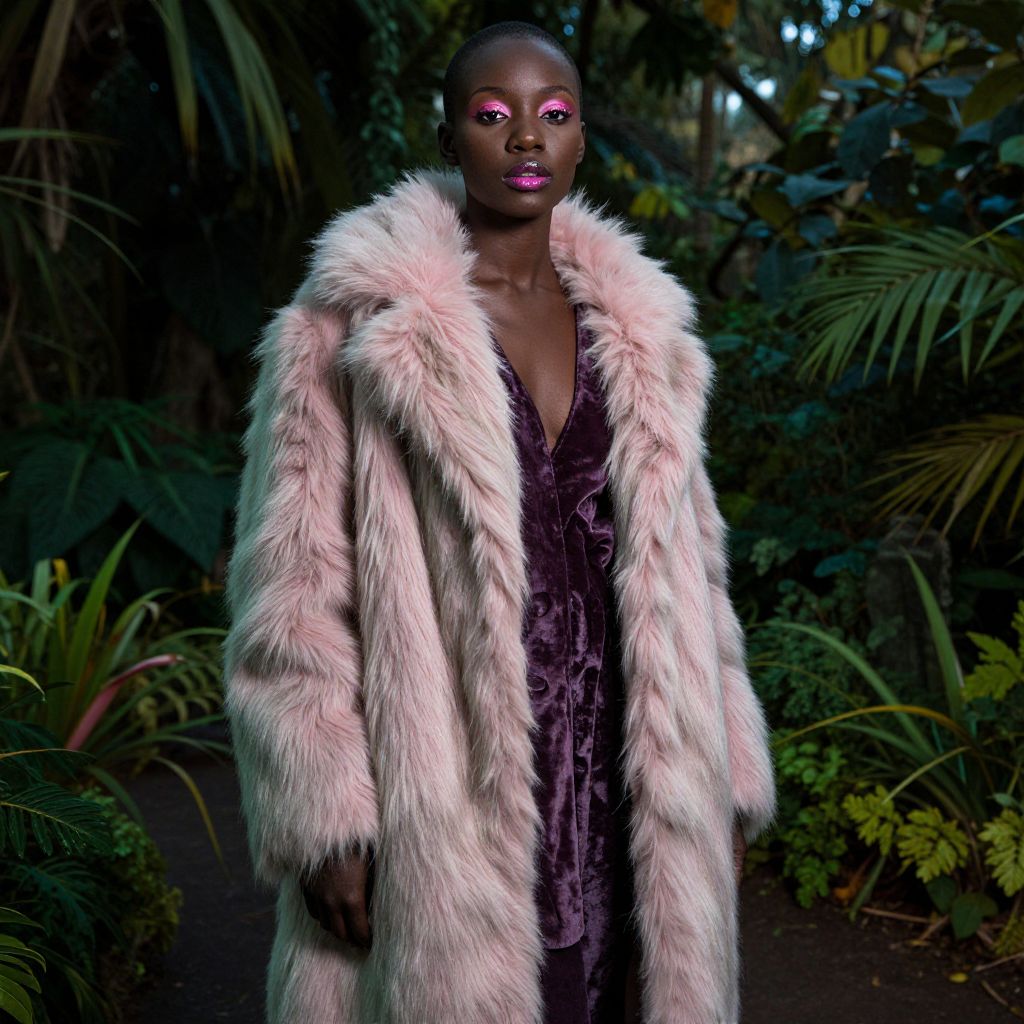 In this captivating image, a black female model exudes elegance and mystery, standing amidst a lush, verdant botanical garden. Her ethereal makeup, featuring vibrant pink hues on her eyes and lips, contrasts beautifully with her dark skin. She is adorned in a luxurious fur coat, its soft pink and green tones adding a touch of whimsy to her ensemble. The coat's texture is rich and plush, with a deep, velvety interior that complements the vibrant exterior. The model's pose is confident and poised, with her gaze directed towards the viewer, creating a sense of connection. The background is a tapestry of greenery, with various plants and foliage creating a natural frame around her. The lighting is soft and diffused, with a hint of night-time ambiance, adding a dreamy quality to the scene. The overall composition is balanced, with the model centrally positioned, and the surrounding elements enhancing her presence without overwhelming her. The image is a stunning example of editorial photography, with its high level of detail and realism, capturing the essence of the model and the environment in a visually striking manner.