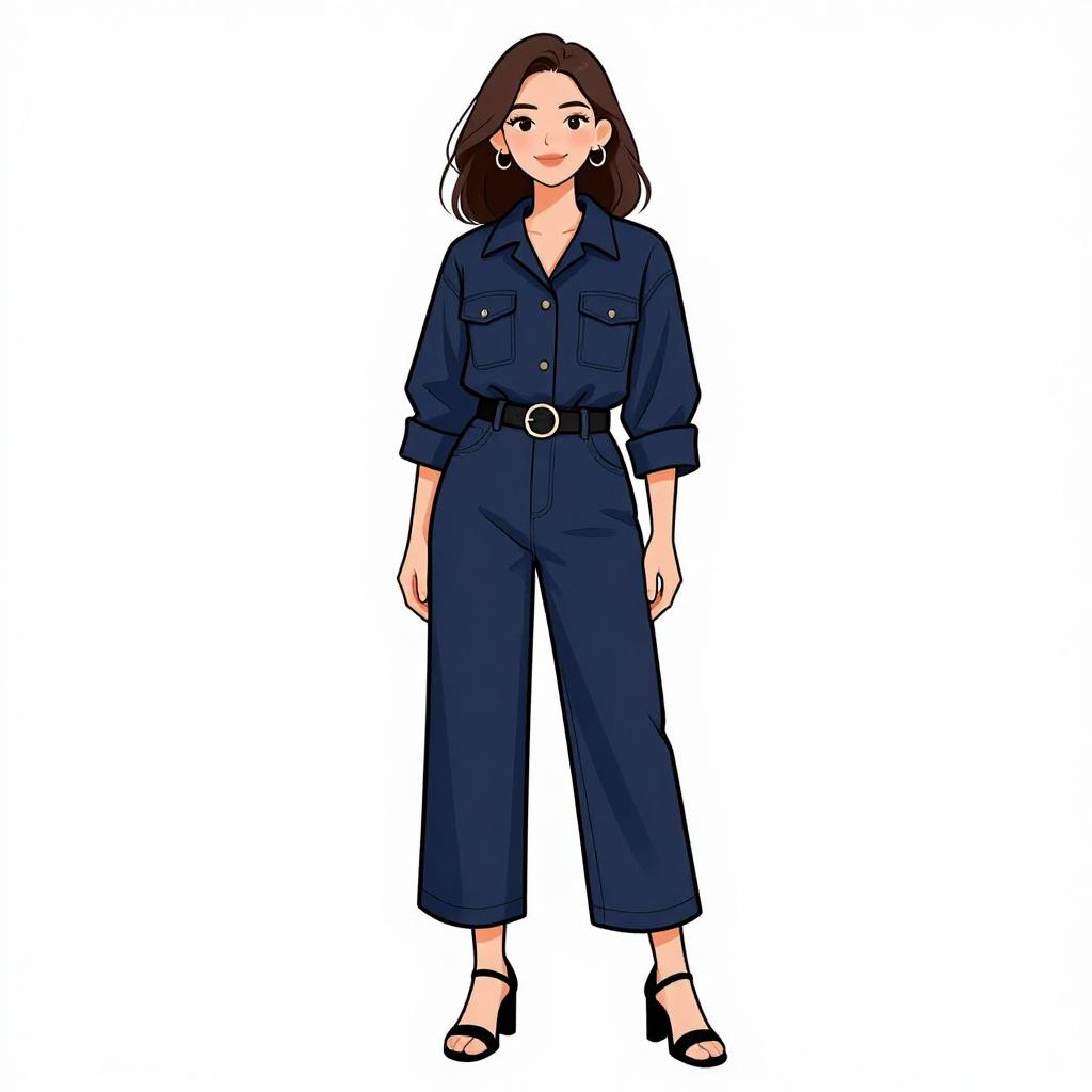 Woman with pretty face and pretty hair. smiling Woman, utilitarian chic, dark navy blue jumpsuit, structured cotton fabric, patch pockets on chest and hips, pointed collar, long sleeves with button cuffs, high-waisted with belt and circular buckle, wide-leg pants, cropped above the ankle, black strappy sandals with mid-block heels, minimalistic makeup, white studio background --sref 1467