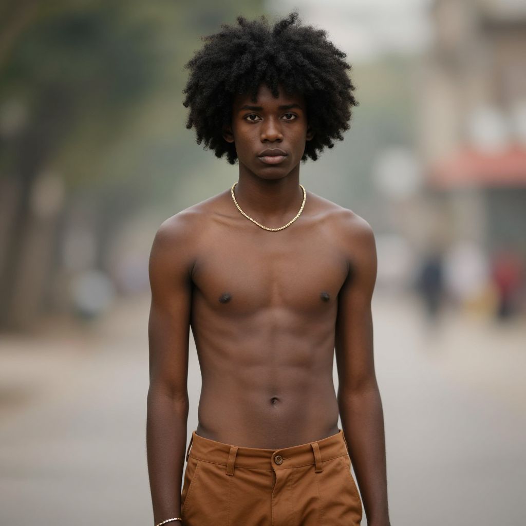"costume afro hairstyle, solo, 1boy, male focus, jewelry, looking at viewer, necklace, black hair, dark skin, standing, pants, bracelet, blurry, outdoors, blurry background, brown pants Realistic photo of casual sexy person with pretty face"