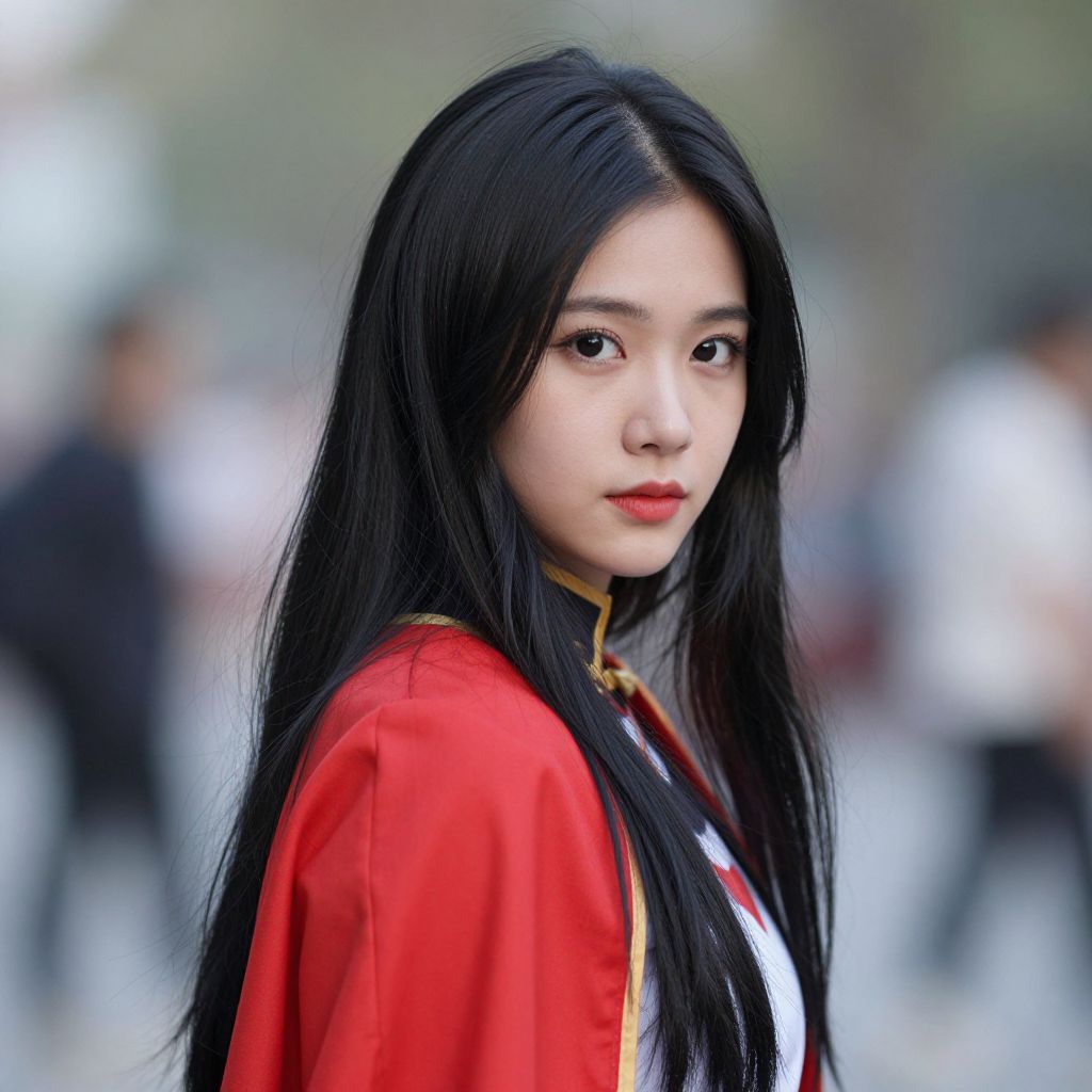 Photograph of an East Asian woman with long black hair, red military-style uniform, and pale skin, standing outdoors with a blurred background of people.
