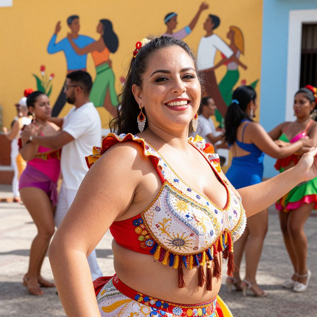 A joyful plus size woman in a festive salsa dress costume, laughing with friends during a community dance celebration in a sunny plaza in San Juan, Puerto Rico, her face full of life, with freckles and a warm smile, standing beside a colorful mural of dancers, bright sun, warm tones, authentic cultural setting, high detail photography. The woman has big breasts and cute face