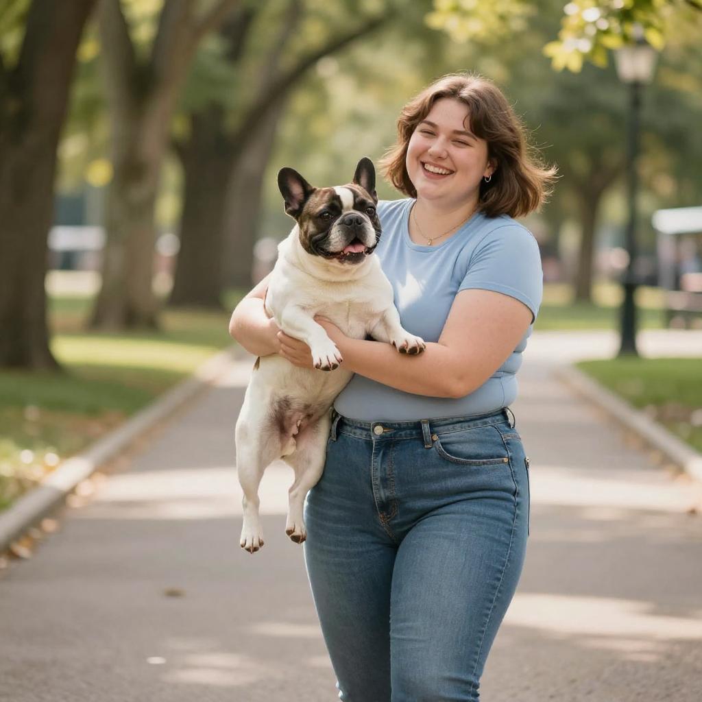Young woman in a park, lifestyle stock photography style, happily hugging her dog, both smiling and laughing, plus-size woman with chin-length bob haircut in a fitted tee and high-waisted jeans, with a French bulldog dog, in tree-lined park trail with dappled sunlight on the ground, warm natural light, soft bokeh background, vibrant colors, high resolution, ultra-detailed