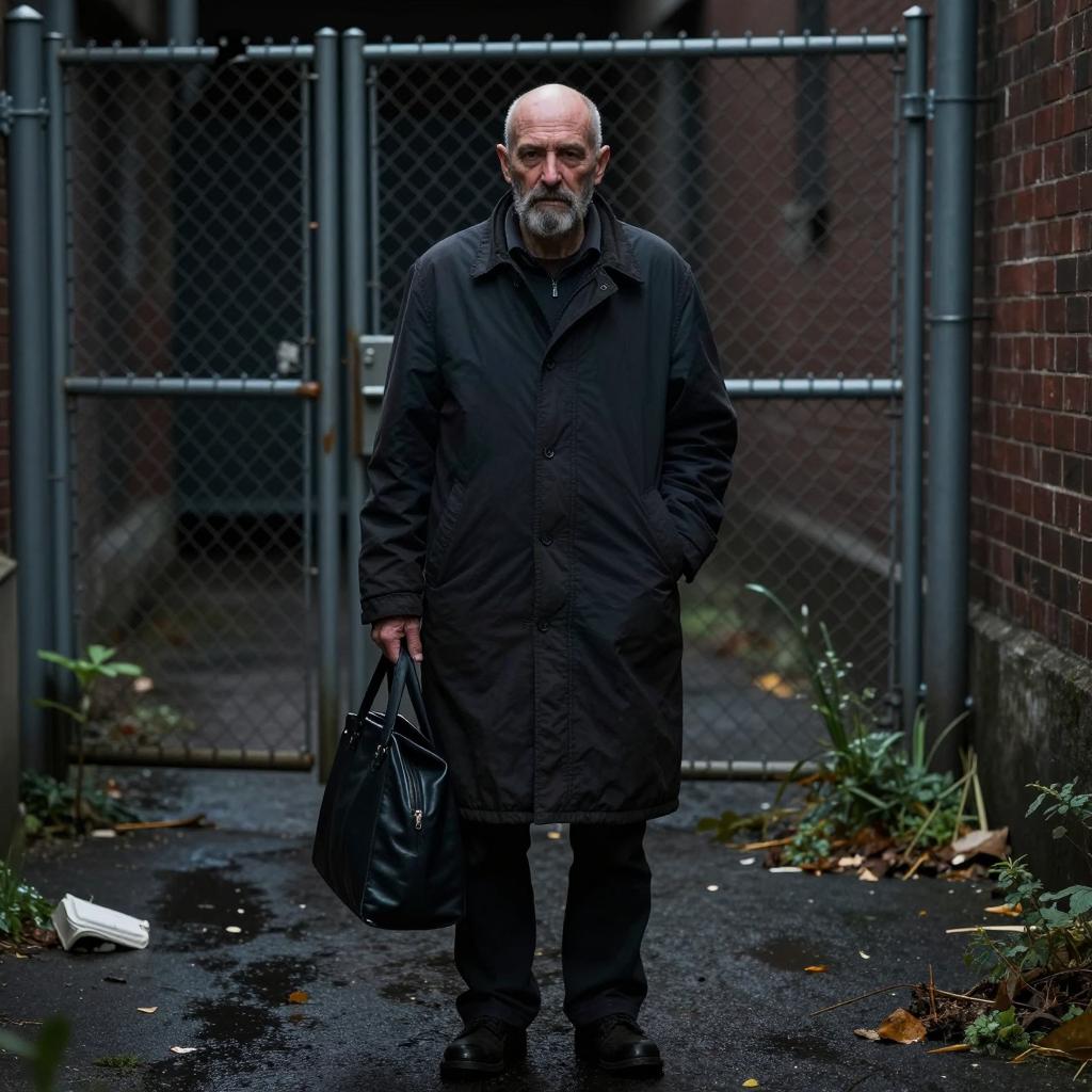 Middle-aged man with gray hair and mustache, wearing a black beanie and dark jacket over a gray shirt, standing outdoors at night. Blurred car lights and indistinct background. Intense facial expression. One person. Urban setting.