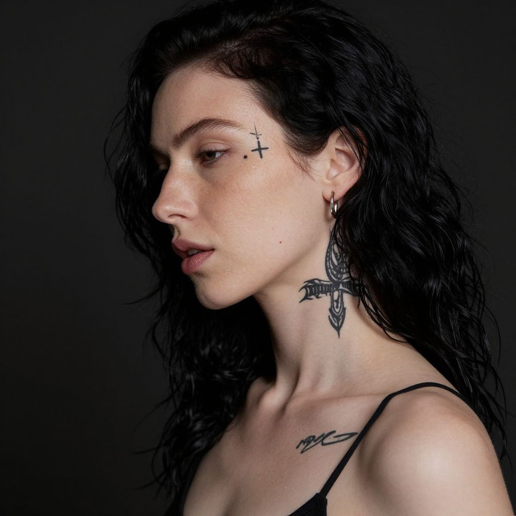 Photograph of a pale-skinned woman with dark, wavy hair, facing left. She has noticeable freckles, black tattoos on her neck and upper chest, and a small cross tattoo under her right eye. She wears a thin black strap top and small hoop earrings. The background is dark, making her and her tattoos stand out. Her lips are slightly parted, showing a relaxed expression.