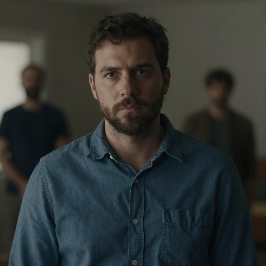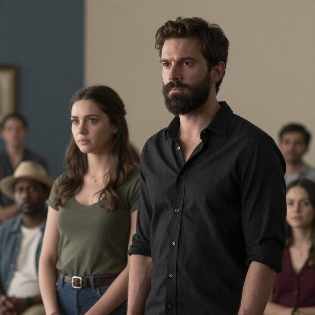 Photograph of a movie scene with a blurred blonde woman in a tank top in the foreground, and a bearded man with dark hair in a leather jacket in the background. The background shows a brightly lit urban street with people and red flowers. The image has a warm, yellowish tone.