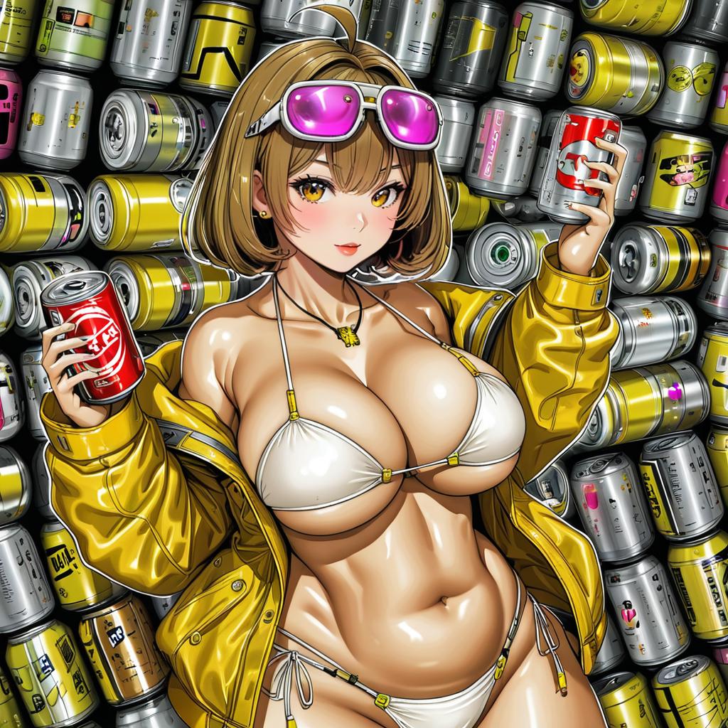 Digital anime-style illustration of a young woman with short brown hair, yellow eyes, and wearing pink-tinted sunglasses on her head. She is dressed in a revealing white bikini with side-tie bottoms, paired with a shiny yellow open jacket. The character holds two red soda cans and is posed against a background filled with numerous metallic soda cans. The artwork emphasizes vibrant colors, glossy textures, and detailed shading, creating a striking summer-themed image.