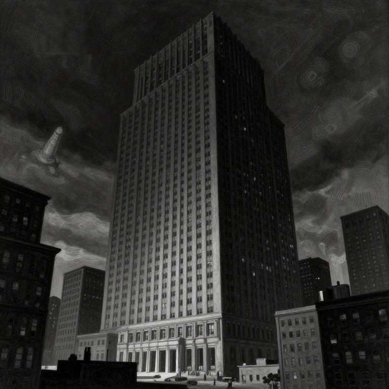 Image in the style of hugh ferriss. black and dark grey. tall, wide, imposing building in a dramatically lit metropolis. eerie. incomprehensible size.
