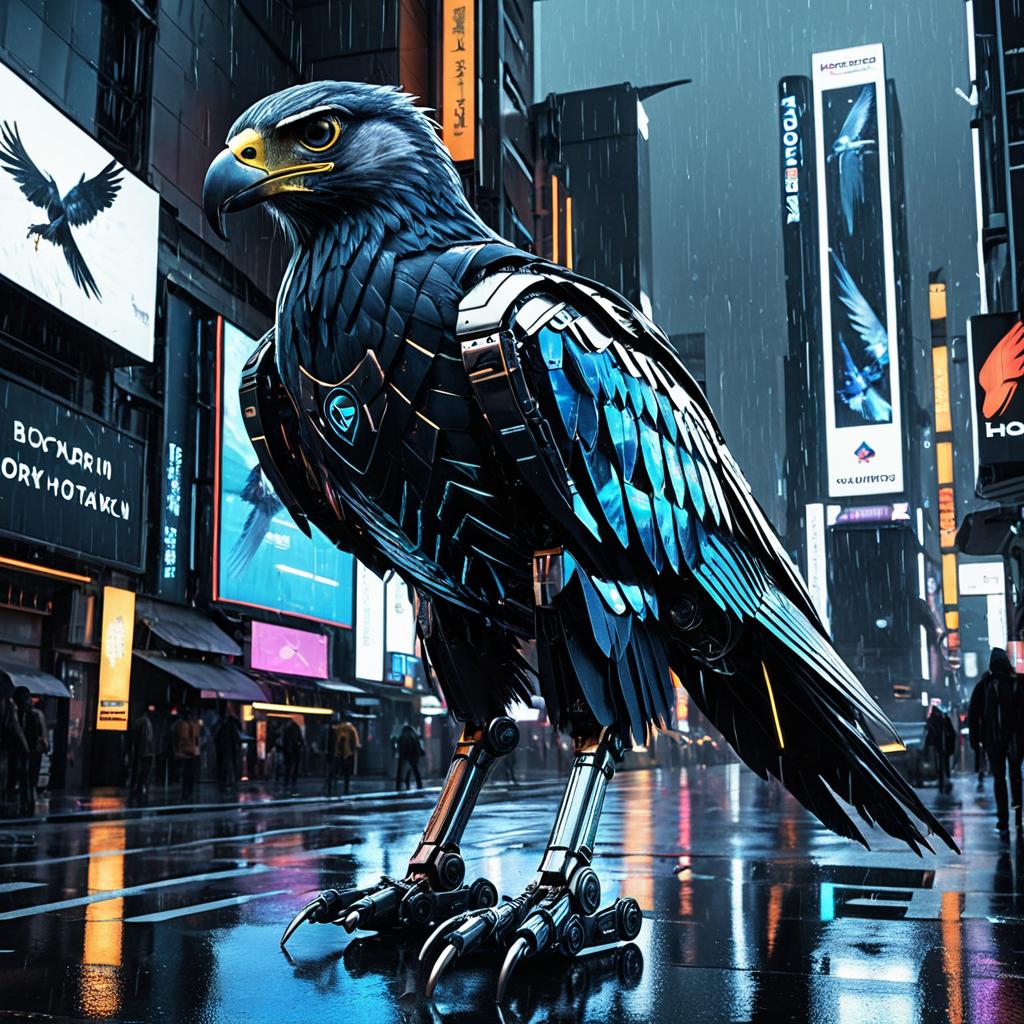 Cyberpunk Titanium Hawk Robot on Rainy City Street