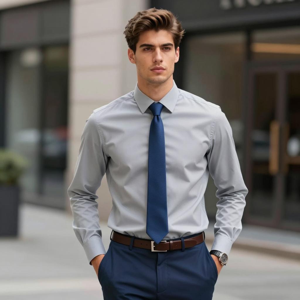 Photorealistic portrait of a handsome young man with light skin and brown hair, wearing a light gray dress shirt, blue tie, blue pants, and a brown belt. He stands confidently with hands in pockets against a blurred urban background, showcasing a modern, professional style in daylight.