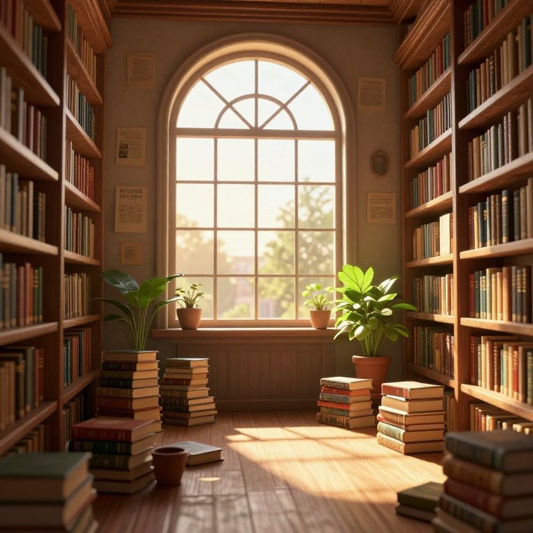 Photorealistic digital painting of a sunlit, wooden library room with tall arched window in the background. The room is filled with tall wooden bookshelves lining both sides, filled with variously colored books. Stacks of books and potted plants are scattered on the wooden floor. Soft sunlight streams through the window, casting warm light and shadows. The walls have small framed pictures and plaques. The overall atmosphere is cozy and inviting, with a mix of natural and warm wooden tones.
