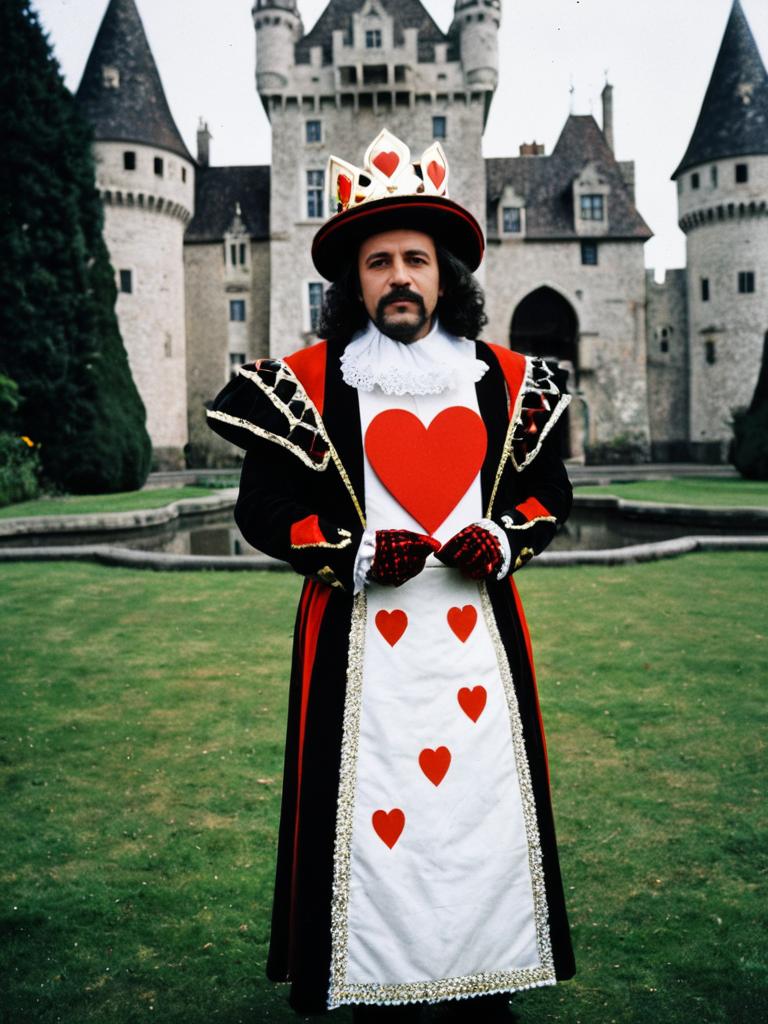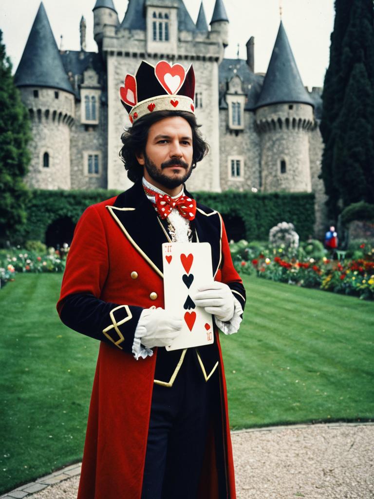 Man in King of Hearts Costume, photorealistic outdoor portrait in castle garden
