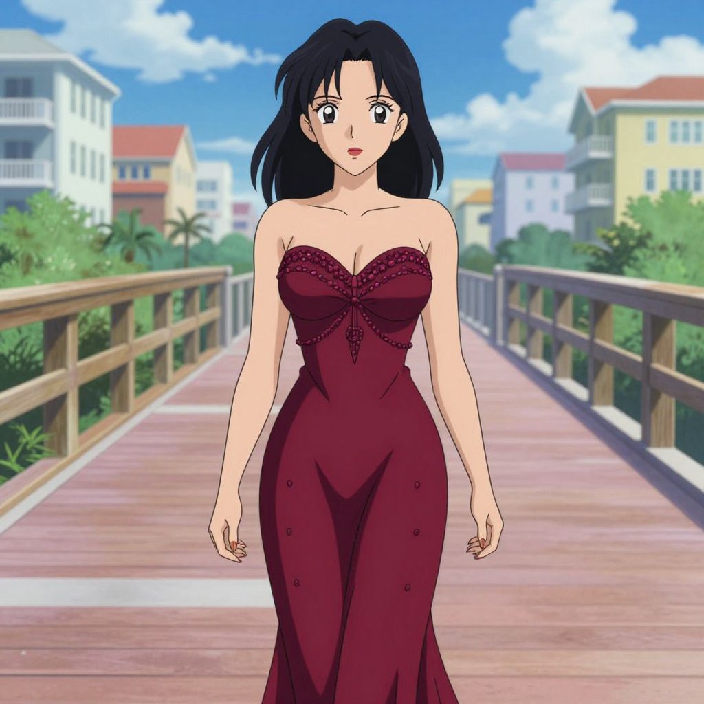 Anime-style digital drawing of a surprised woman with black hair in a strapless, maroon, form-fitting gown, walking on a wooden bridge with