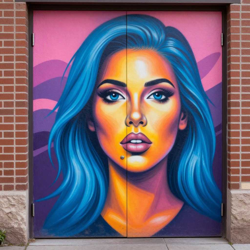 Vibrant graffiti mural of a woman with striking blue hair, orange and purple hues, on a red-brick garage door.
