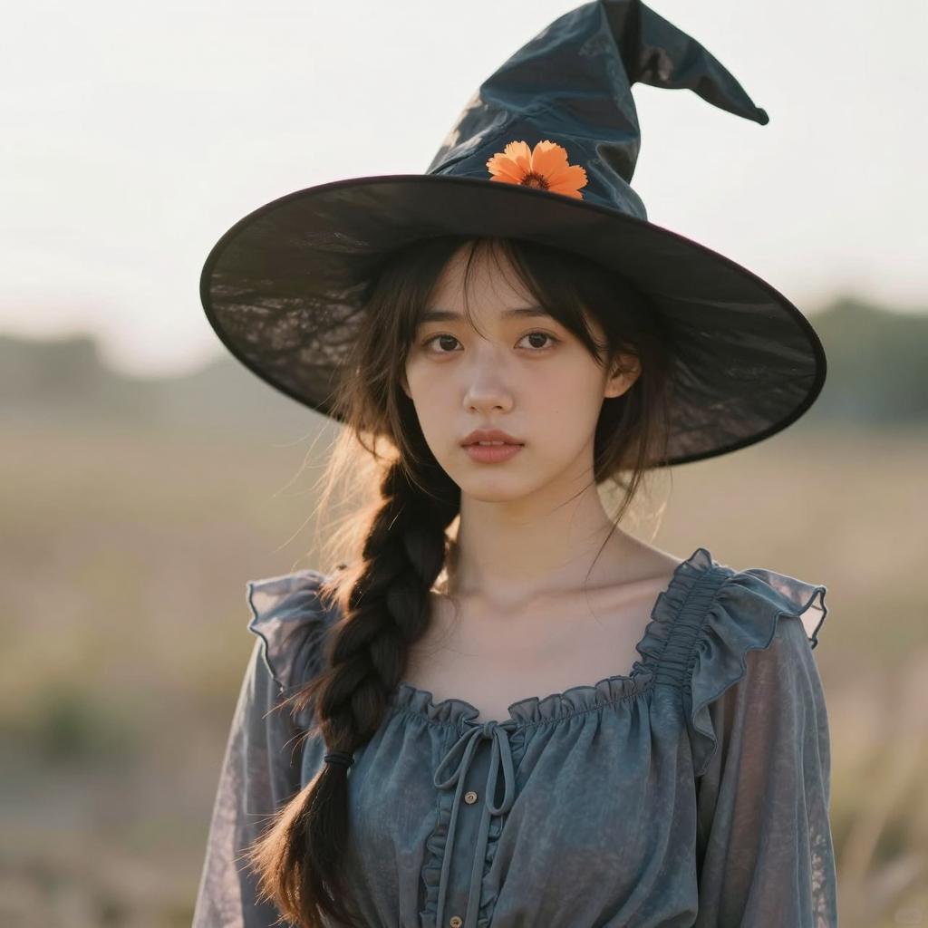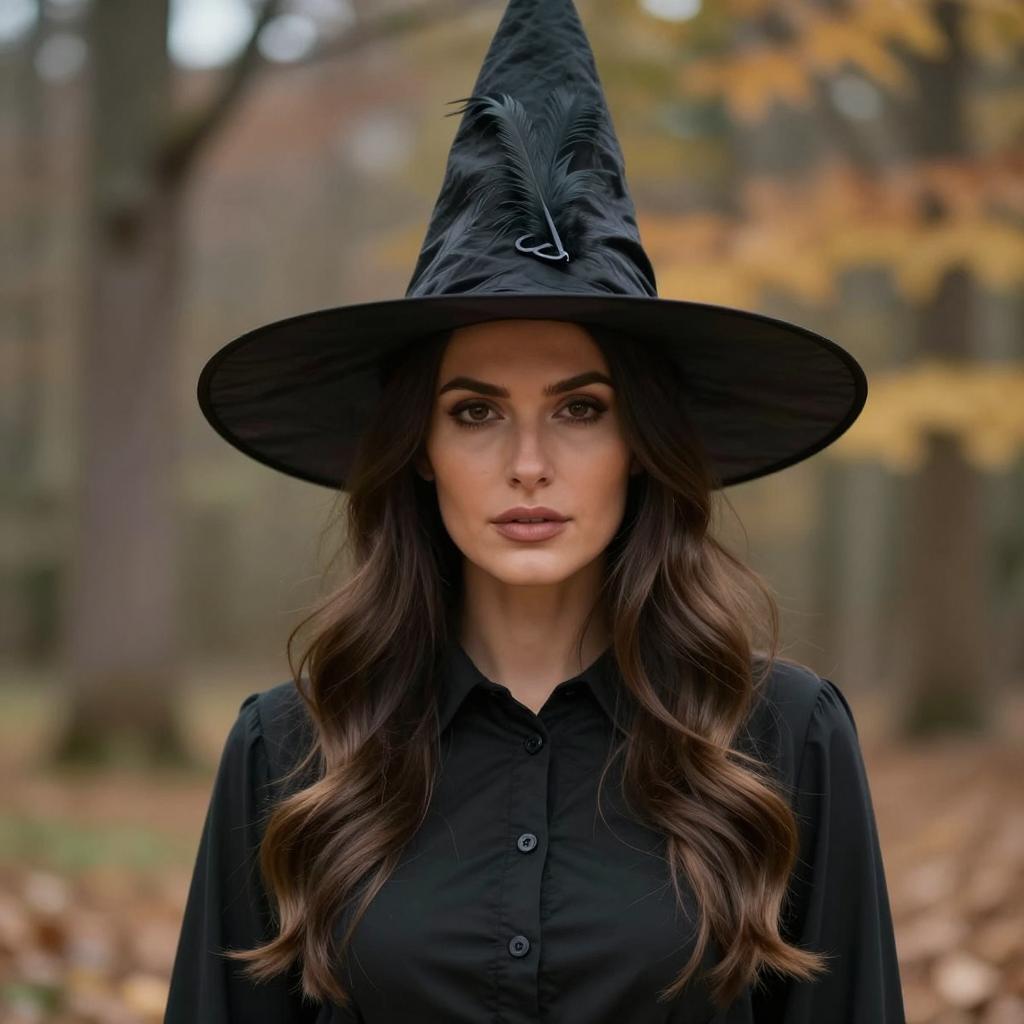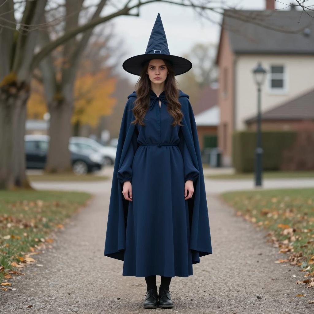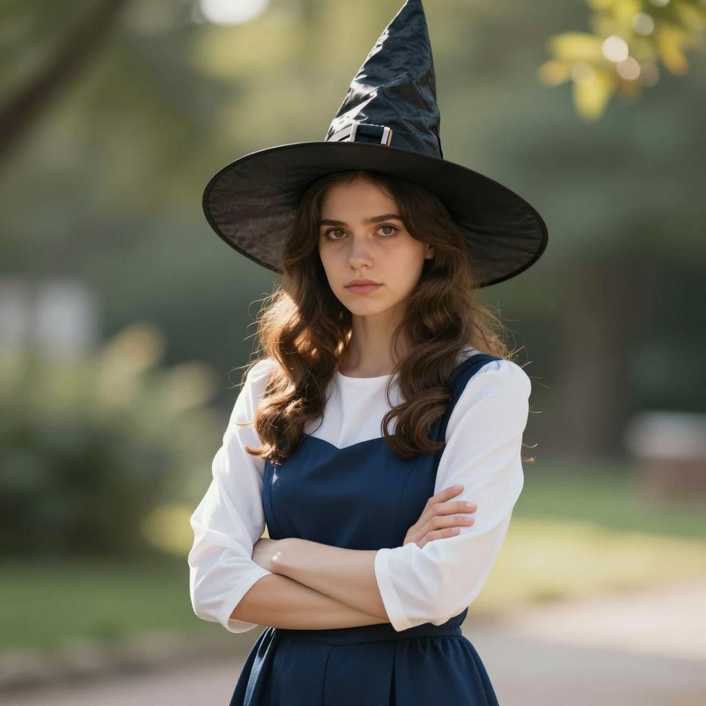 Quality witch costume, photo of a young woman with wavy brown hair, wearing a black witch hat and a dark blue dress with white sleeves, arms crossed, standing outdoors, green blurred background, sunlight, serious expression, realistic style, medium shot, T2I-generated, detailed, natural light, summer day, fantasy character, front view, confident posture