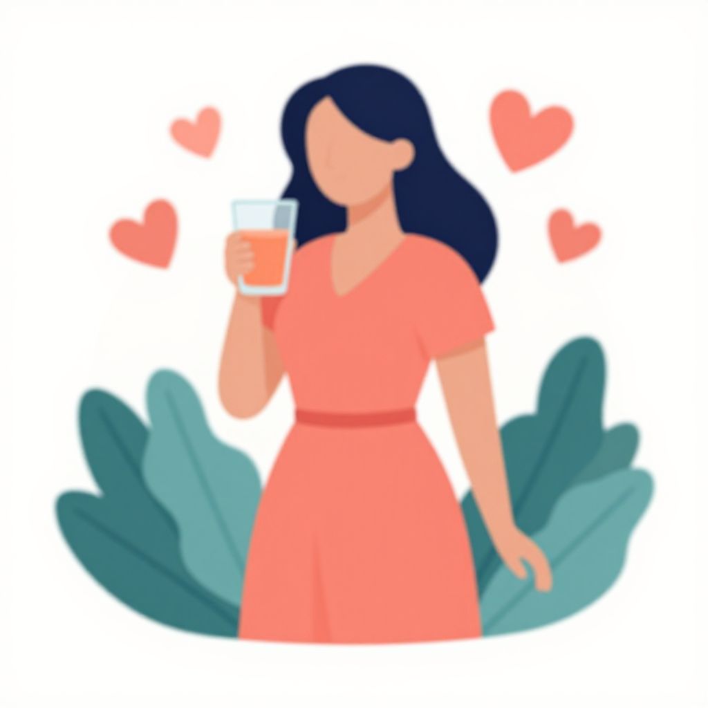 A vibrant vector illustration depicts a woman in a coral dress holding a glass of juice, surrounded by heart symbols and leafy plants, symbolizing themes of menopause, heart health, and cholesterol in a clean, digital art style with soft pastel tones and minimalist design elements.