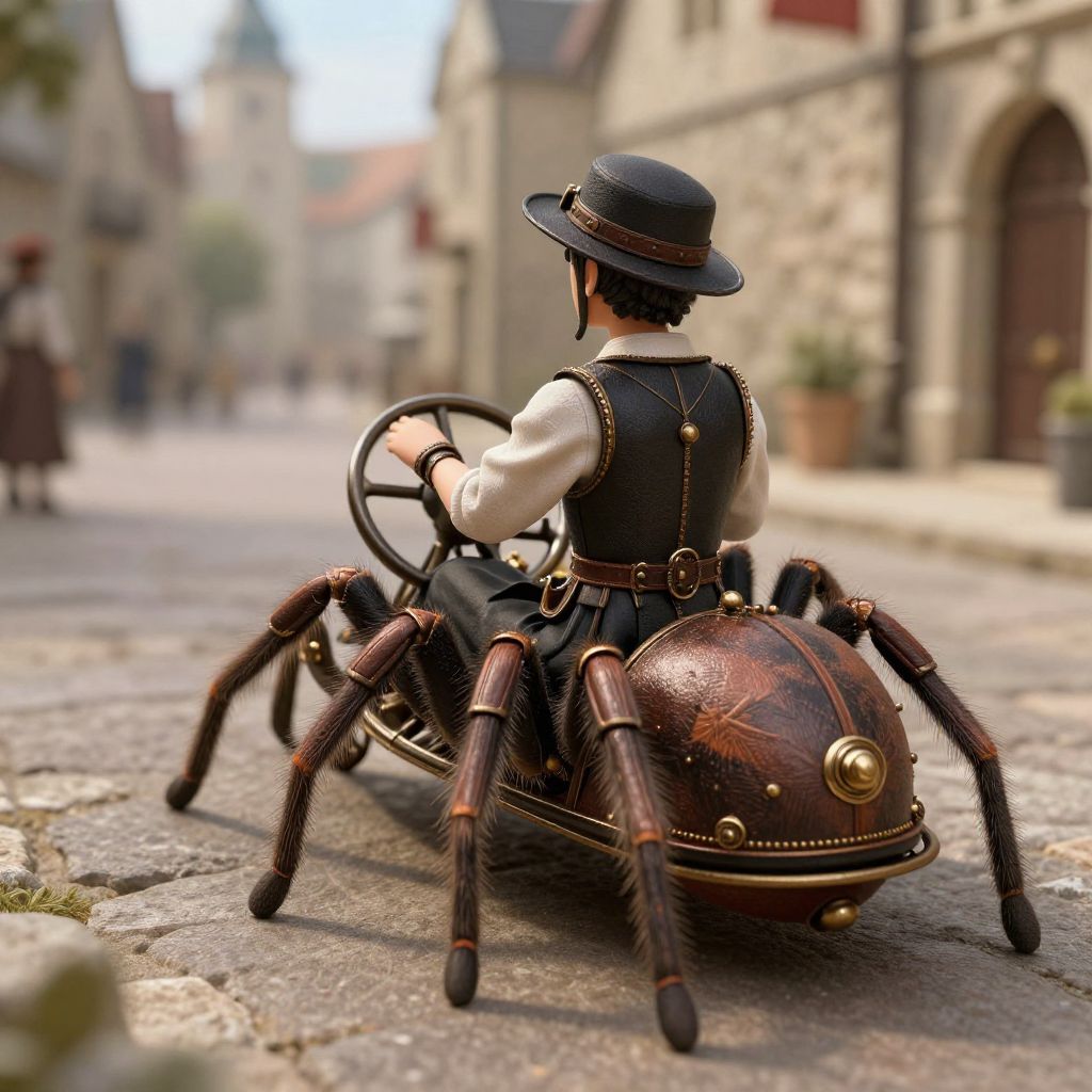 Photo-realistic image of an elegant person dressed in vintage steampunk attire steering a mechanical tarantula spider vehicle through a cobblestone street in a historic town. The rider wears a black hat and matching vest with brass embellishments, guiding the intricately designed spider-like machine featuring leather and metallic details. The background shows blurred stone buildings and archways, evoking a vintage European setting.