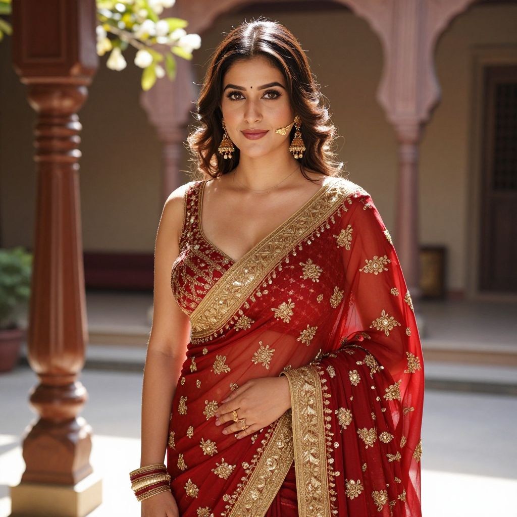 A beautiful wedding saree woman in her late 20s with soft brown eyes, fair skin, and a gentle smile, wearing a richly embroidered red and gold Gujarati wedding saree, standing in a traditional haveli courtyard with jasmine flowers and ornate wooden pillars in the background, sunlight streaming through the arches, capturing the elegance of the saree costume in natural light.. The woman has big tits and cute face