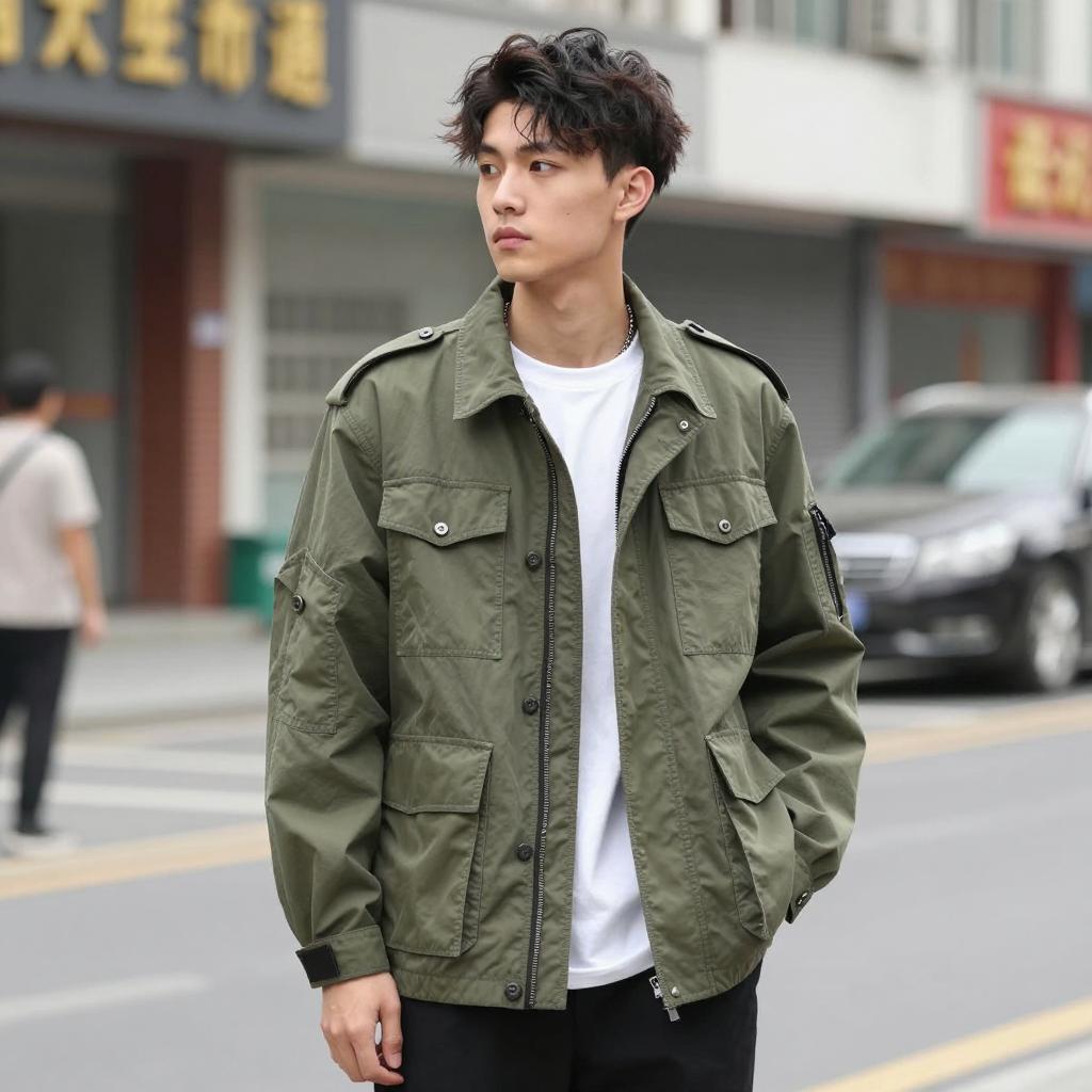 A stylish young man poses confidently in a casual military-inspired jacket, showcasing a blend of modern fashion and rugged aesthetics. The image captures the essence of urban style set against a softly blurred street background, illustrating a vibrant lifestyle.