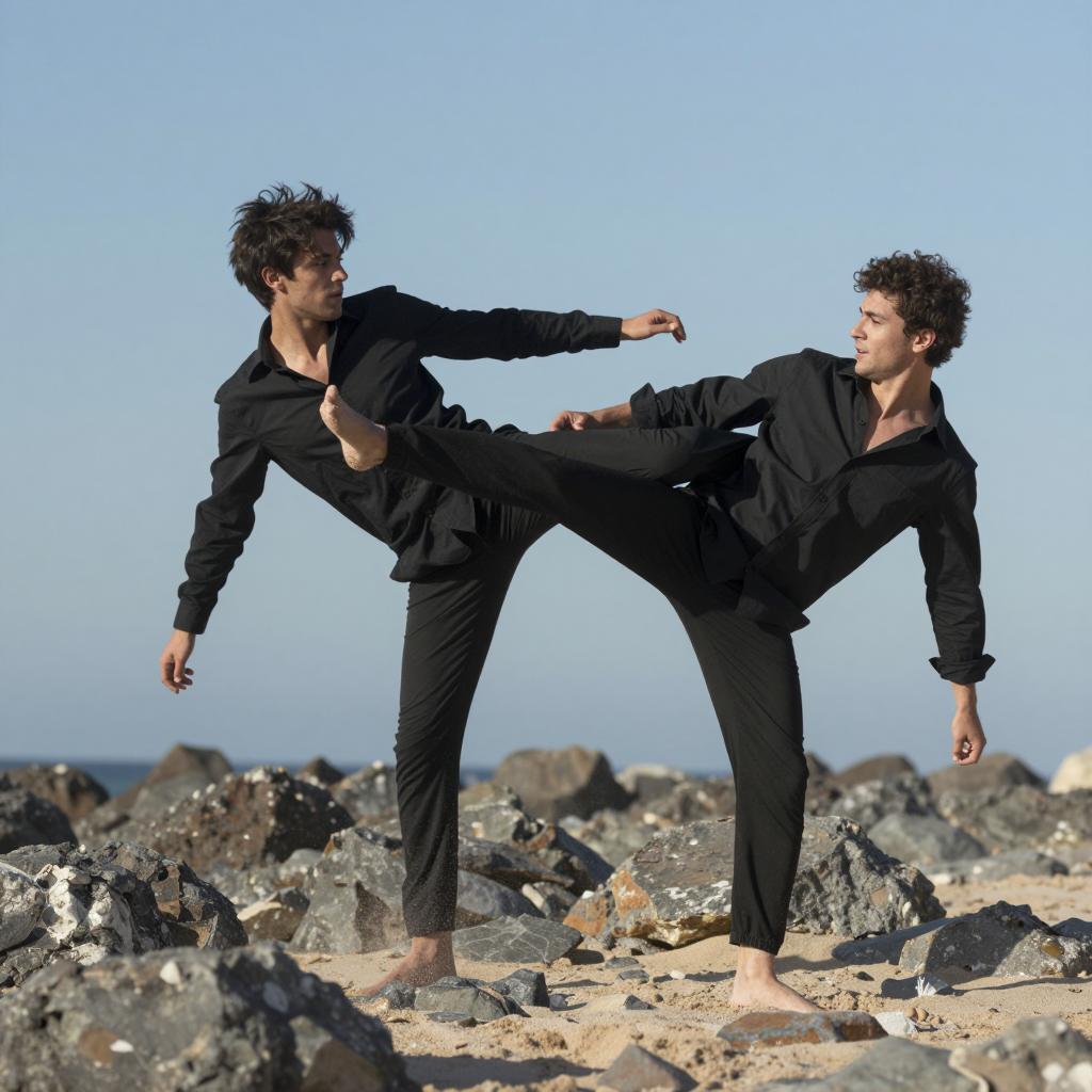 Two people in a bedroom. One, dark-skinned male in red pajamas, mid-air, leaping toward a door. Other, light-skinned male in red pajamas, on bed, legs outstretched. Yellow walls, open door, stairs on left, bed with white headboard. Intense motion, dynamic pose.