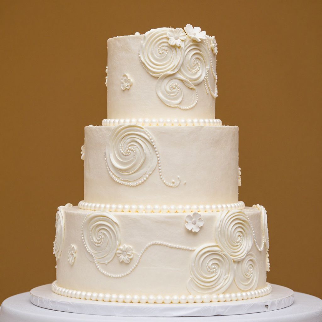 Elegant three-tiered wedding cake adorned with intricate white swirls, pearl-like beads, and floral accents, presented on a pristine white base against a warm-toned backdrop.