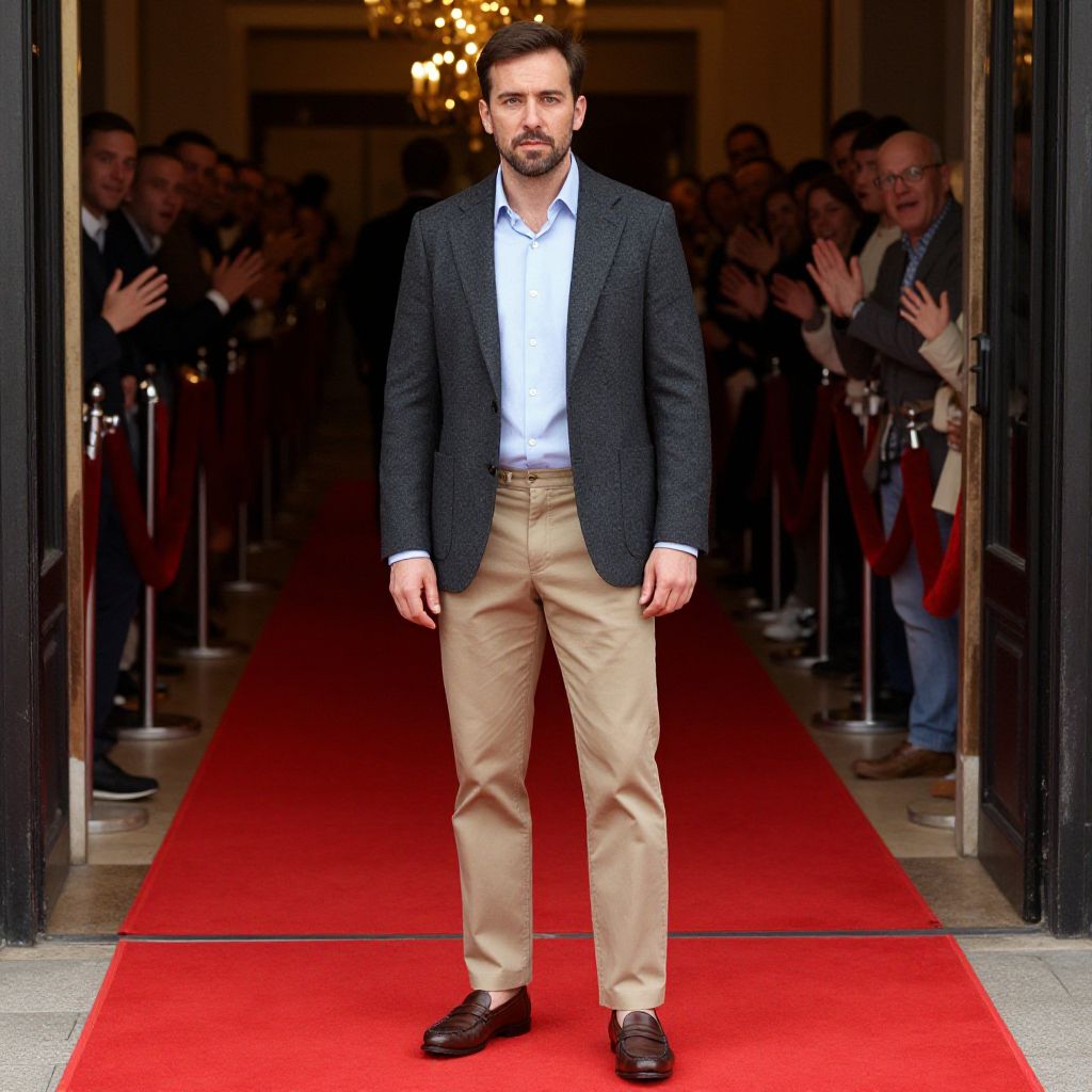 A man, charcoal gray blazer, light blue button-up shirt, slim-fit khaki chinos, brown leather loafers, standing at a red carpet entrance, glimmering lights, excited crowds, hand-tinted photograph, confident expression. Man has masculine face and piercing eyes